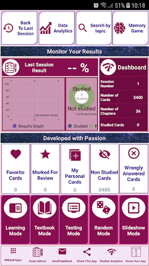- Get the most advanced data analytics features that analyses your study session by study mode, scores, time spent…etc.