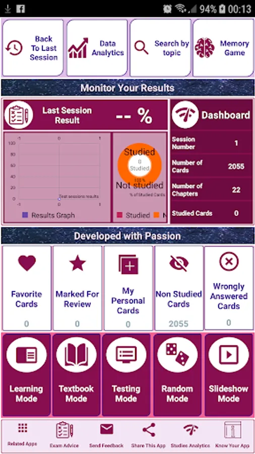 - Get the most advanced data analytics features that analyses your study session by study mode, scores, time spent…etc.