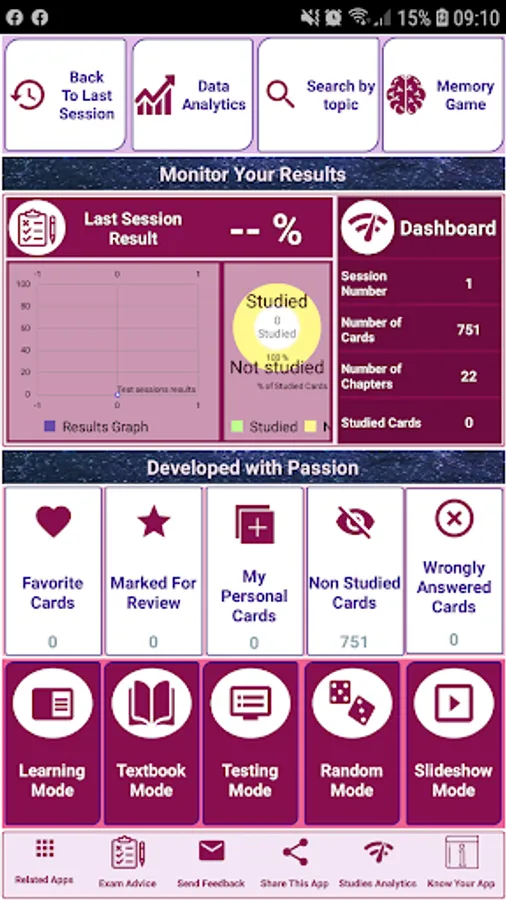 - Get the most advanced data analytics features that analyses your study session by study mode, scores, time spent…etc.