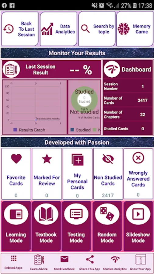 - Get the most advanced data analytics features that analyses your study session by study mode, scores, time spent…etc.