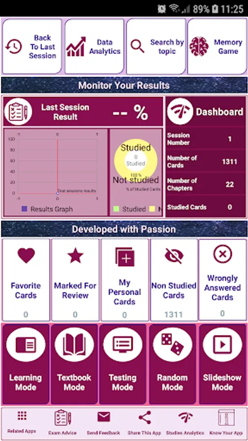 - Get the most advanced data analytics features that analyses your study session by study mode, scores, time spent…etc.