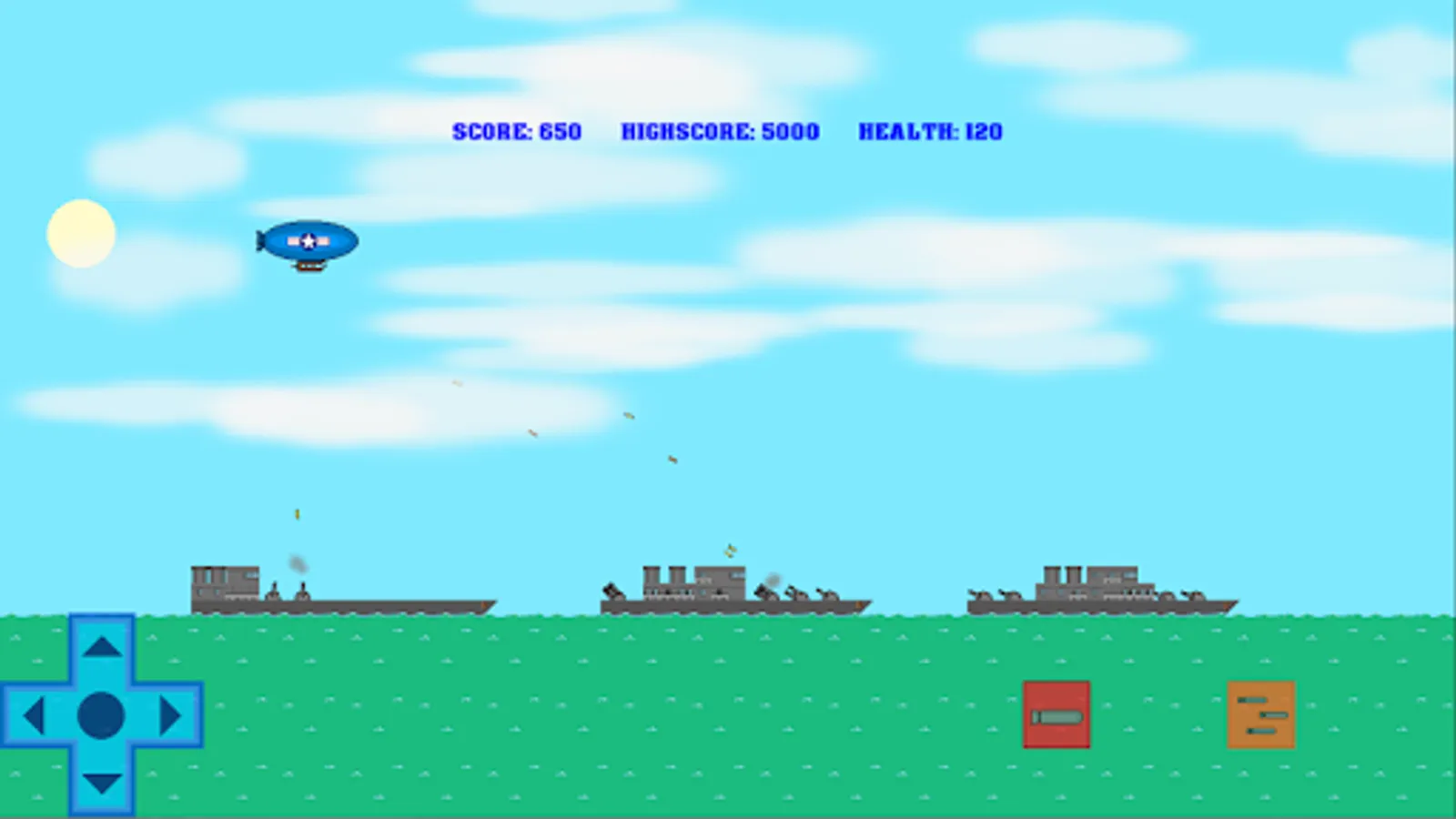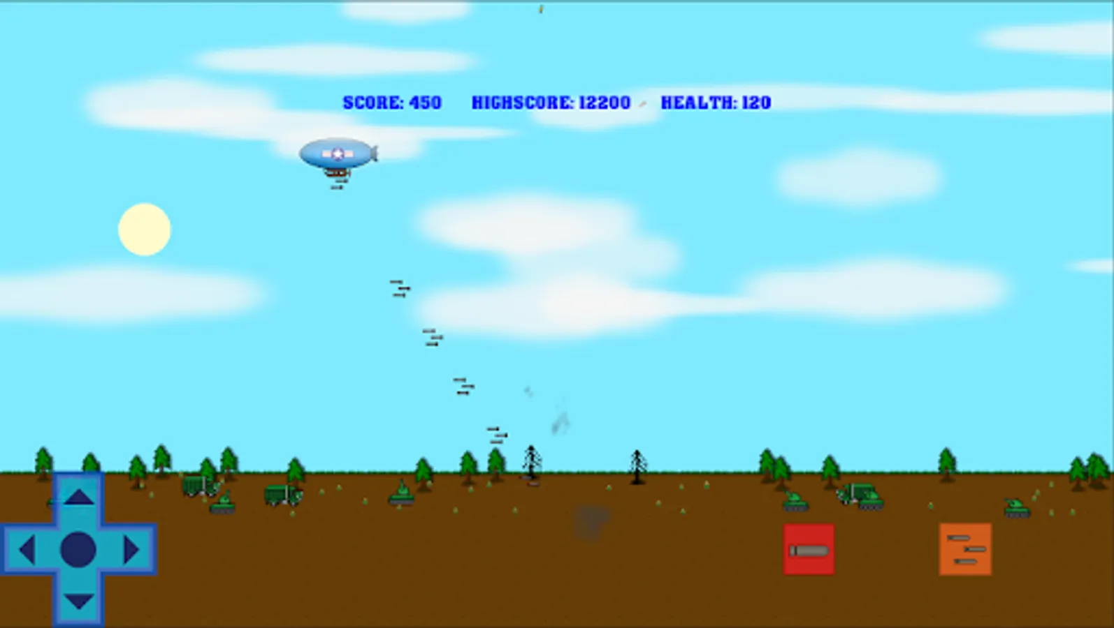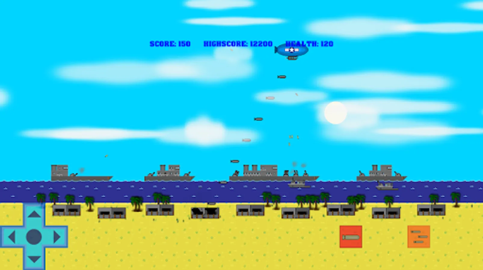 You are in command of a WW2 blimp. Fly overhead and drop bombs on various targets such as soldiers, tanks, ships, sailors, camps, skyscrapers and more! Have fun fighting the war in this retro aircraft bomber air to ground air raid strike battle arcade game!