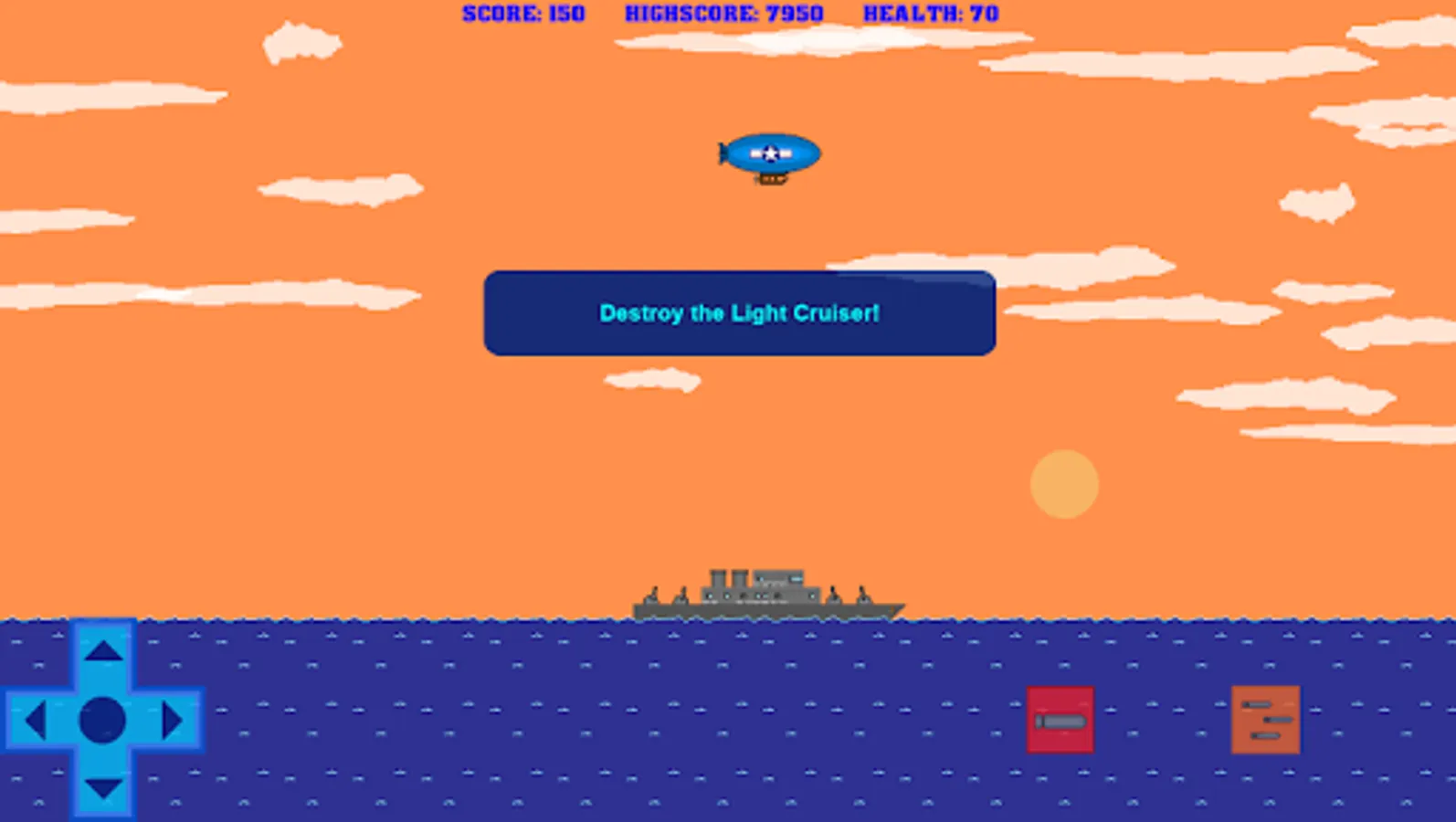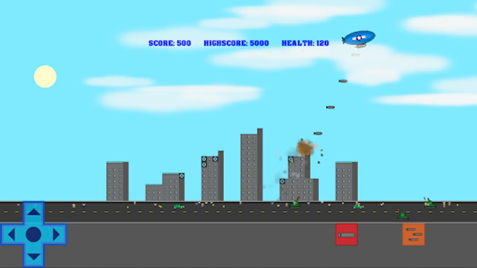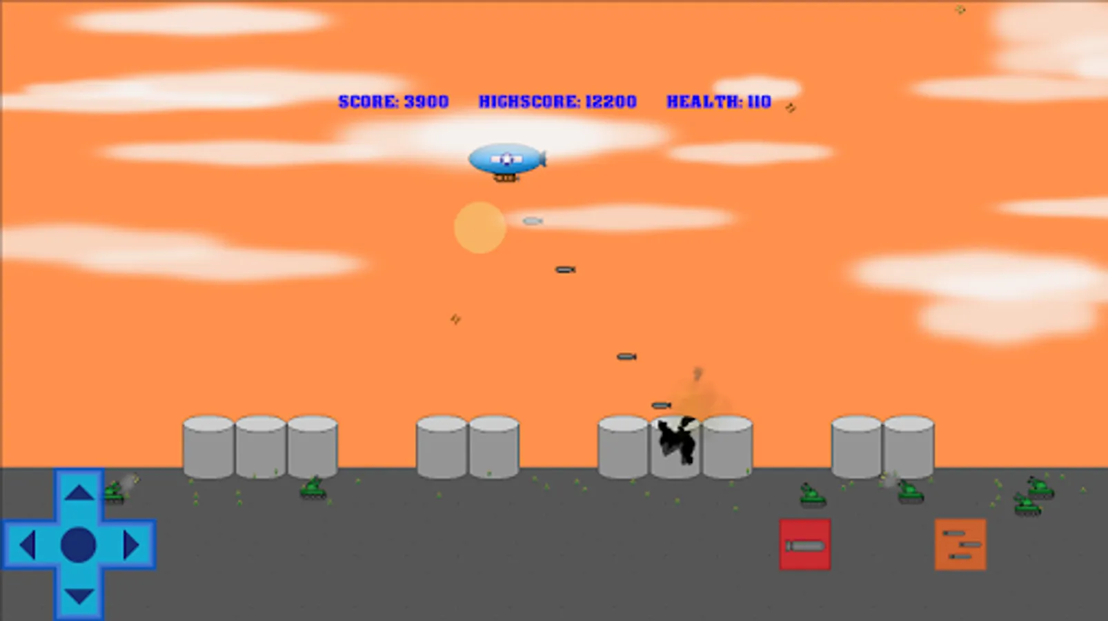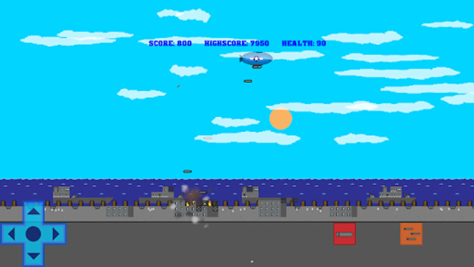 You are in command of a WW2 blimp. Fly overhead and drop bombs on various targets such as soldiers, tanks, ships, sailors, camps, skyscrapers and more! Have fun fighting the war in this retro aircraft bomber air to ground air raid strike battle arcade game!