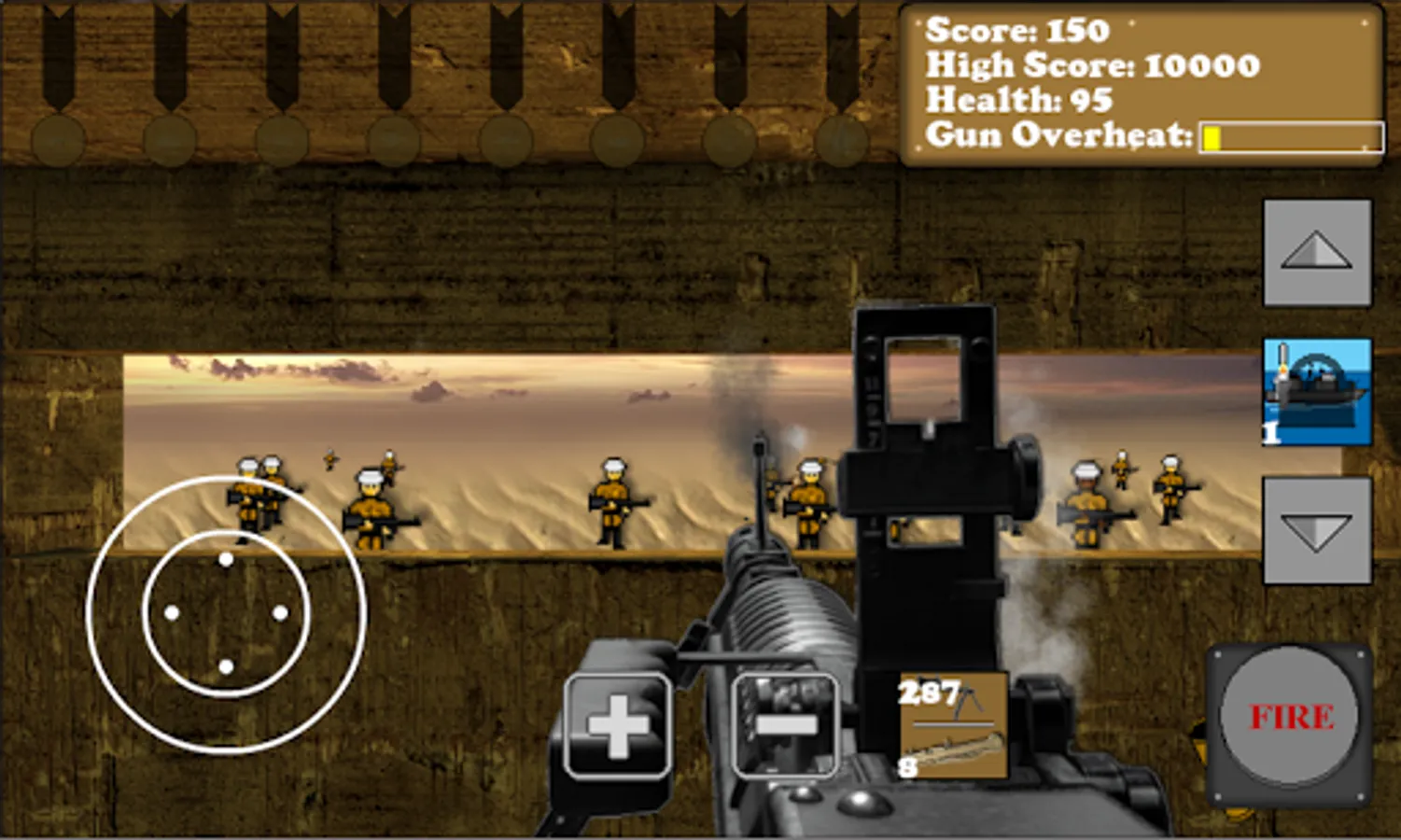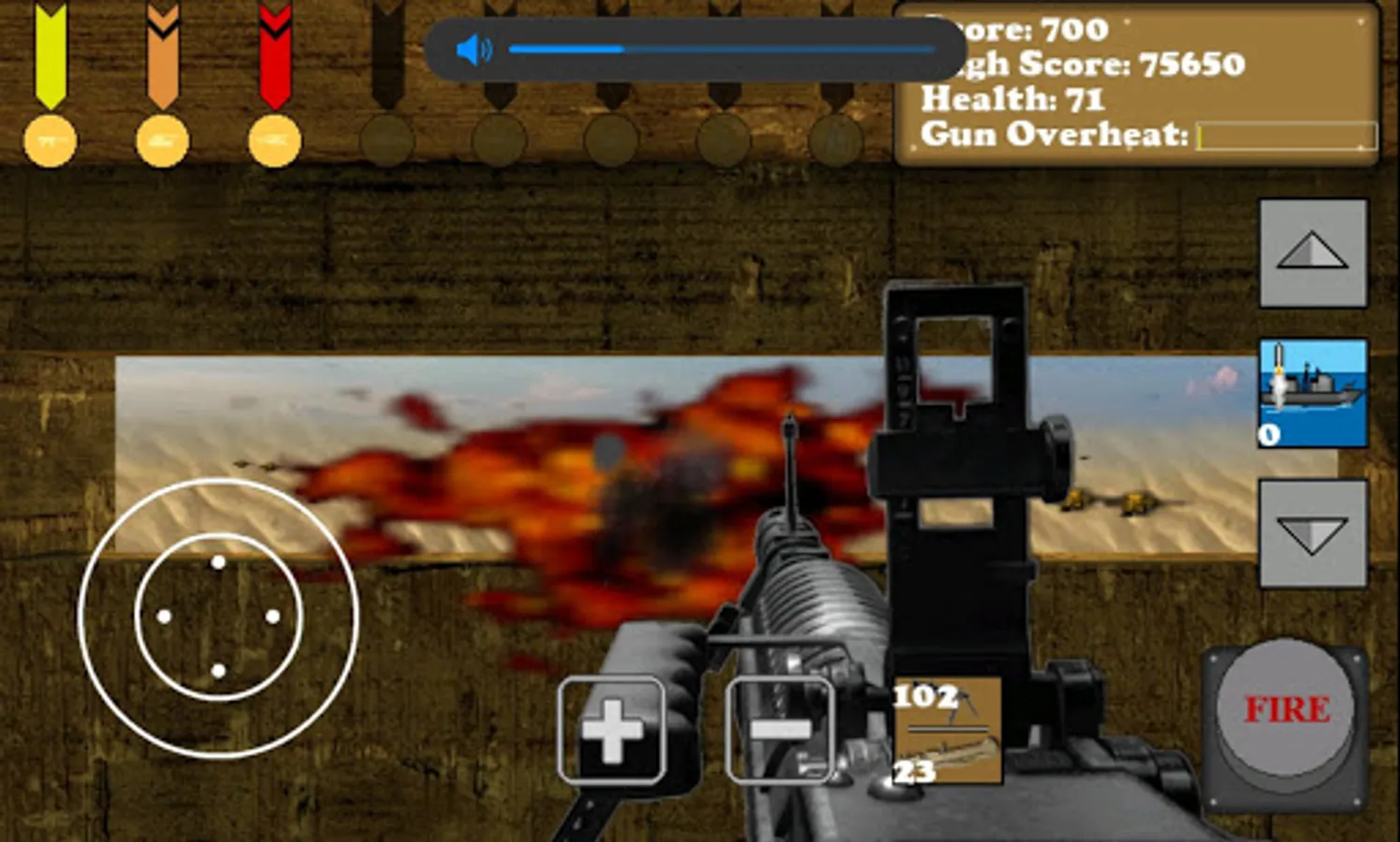 Take the gunning action to the heated Middle East region for modern desert warfare action! It is the near future and the Middle East region has become unstable , war has broken out. NATO forces have begun "Operation Stronghold" and established fortifications throughout the region. These are designed to help defend critical areas against the wide spread growing militia threats. You are a bunker gunner in one of the many fortifications. You are to shoot as many enemy militias and enemy as possible before they over take the bunker. Hold out as long as you can and fire away with your weapons!