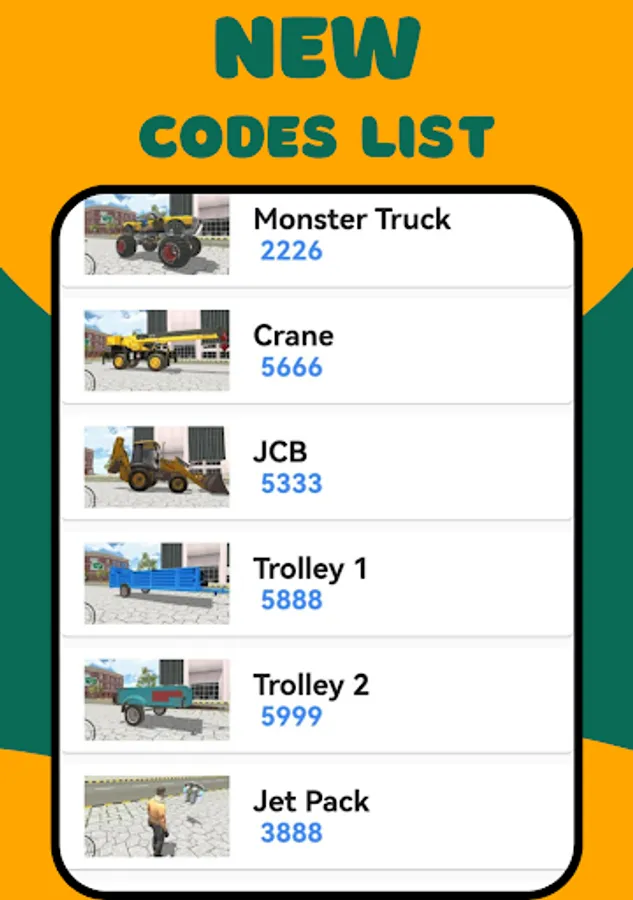 Our app is tailored to cater to the needs of every player seeking to explore new horizons within the game. Whether you're yearning to ride a powerful Bike, cruise in a luxurious Super Car, experience the speed of a Horse, soar through the skies in a Helicopter, navigate the terrain with a Tractor, or embrace the futuristic thrill of a Jetpack, our comprehensive code list has got you covered.