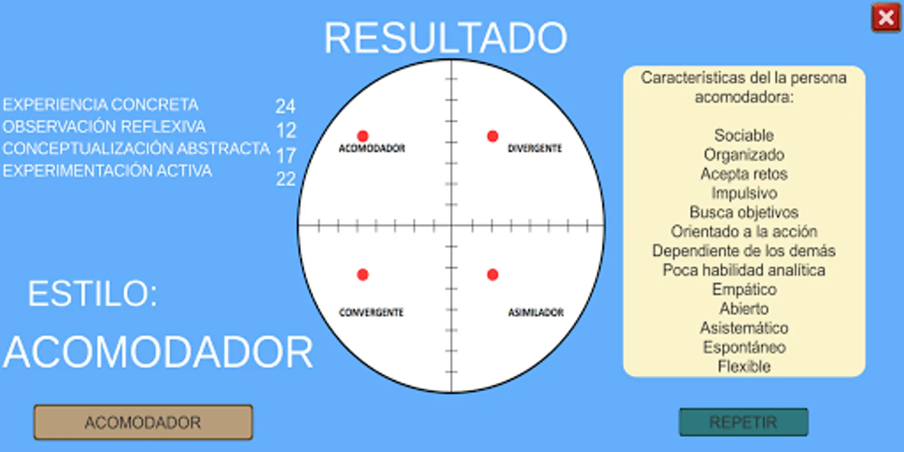 This application developed based on this test in addition to determining the type of learning determines certain characteristics linked to the specific type.
