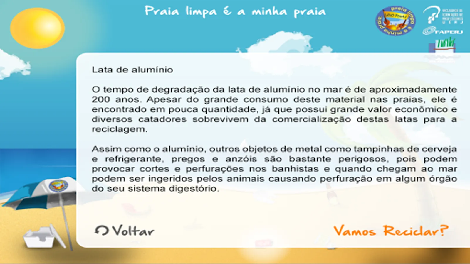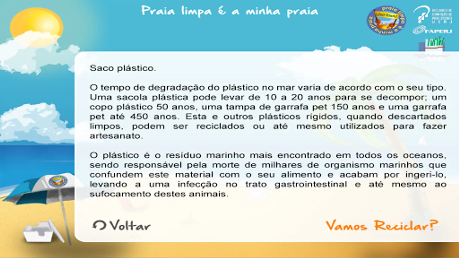 "Praia Limpa é a Minha Praia" is an extension project carried out by the Faculty of Teacher Training of the State University of Rio de Janeiro (UERJ-FFP) and SEA PROJECTS. Its objective is to raise public awareness of the impacts caused by pollution in the coastal environment. Studies are carried out with emphasis on the analysis of the composition, quantification and distribution of garbage, both in the waters of Guanabara Bay and on its beaches".