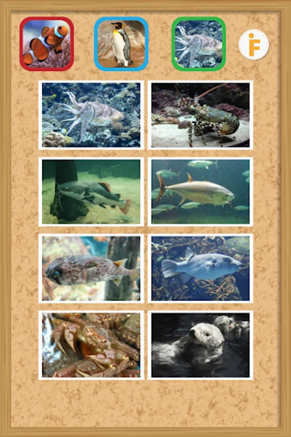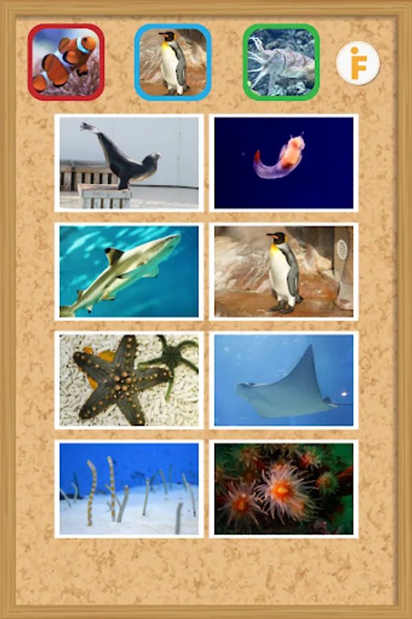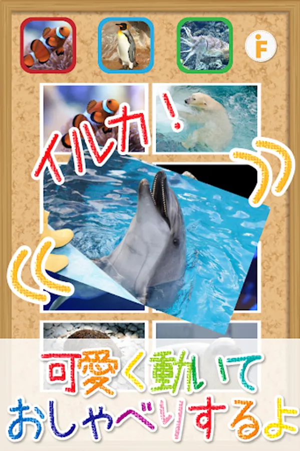 イルカなどの写真をタッチすると、写真がアップになり動きながら「イルカ」とおしゃべりして可愛い音がなります。