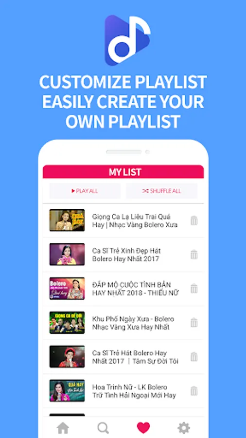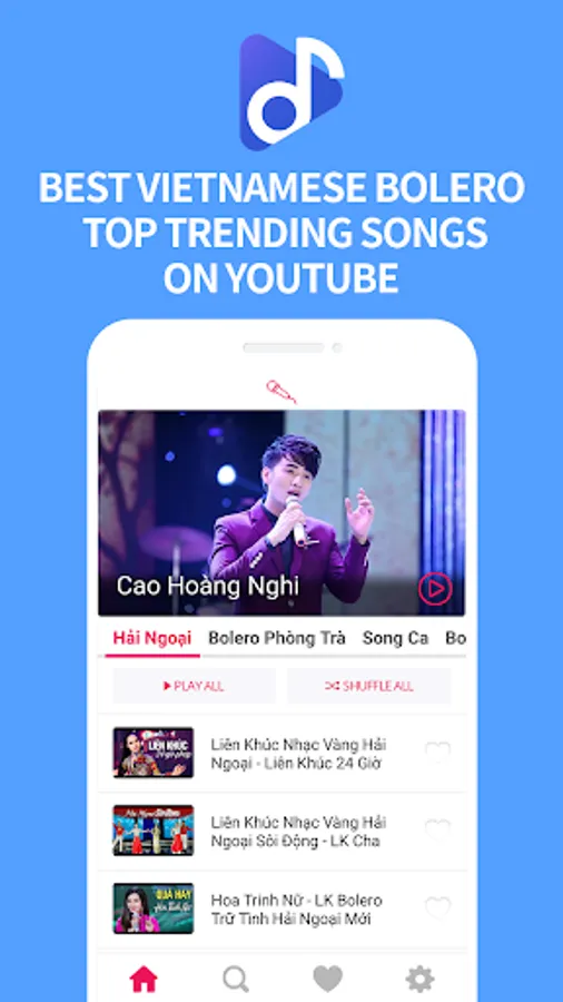 In this application, you can listen to the best Vietnamese bolero music, overseas bolero music (nhạc vàng hải ngoại), lyrical music (nhạc trữ tình), wedding music (nhạc đám cưới), love songs (nhạc trữ tình), and nonstop music, sung and performed by the most famous artists like: Trường Vũ, Tuấn Vũ, Cao Hoàng Nghi, Lệ Quyên, Mạnh Đình, Chế Linh, among many more. Plus, you can create your own playlist of your favorite Vietnamese bolero songs. Download Vietnamese Bolero Music right now and enjoy the best Vietnamese bolero music of all time!