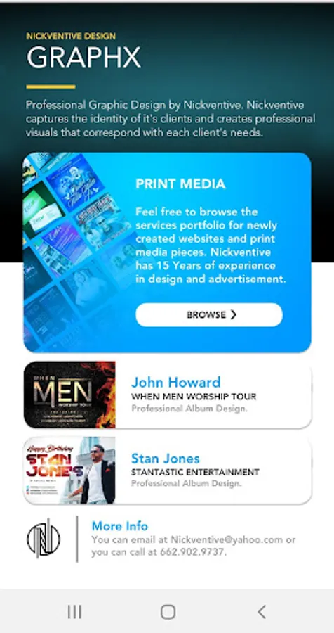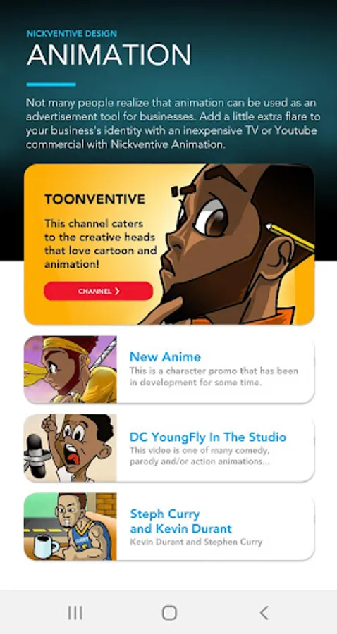 Nickventive is an design portfolio app that offers potential clients professional design, animation and web graphics. This business was started in 2014 and this app illustrates a cool and creative approach to design and animation. There are always new things to see on the Nickventive App.