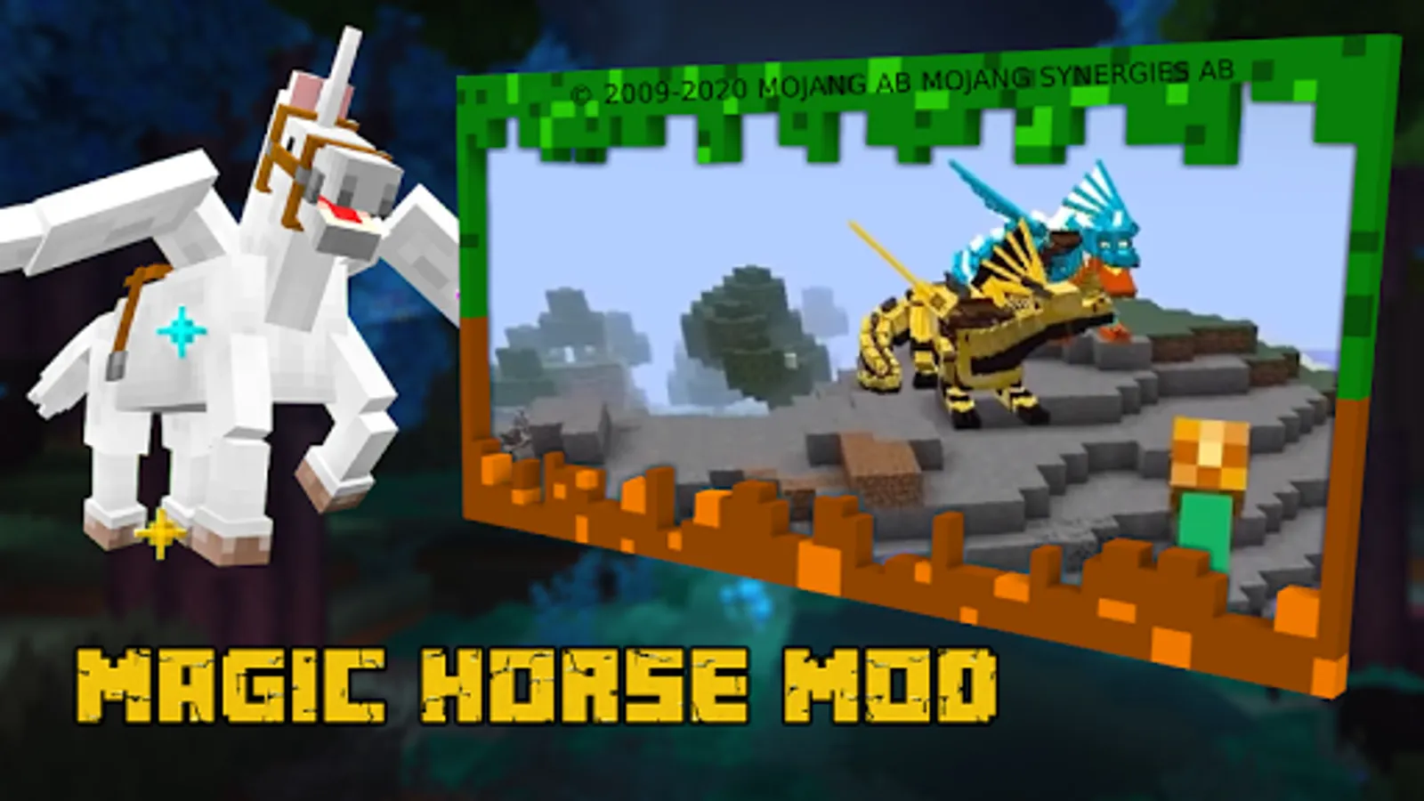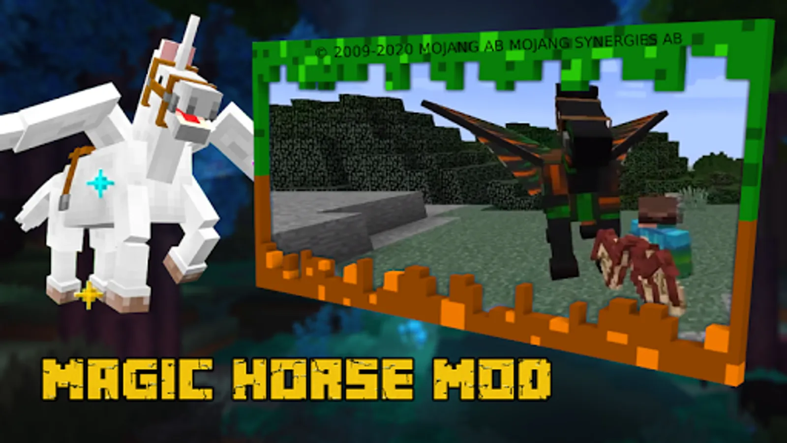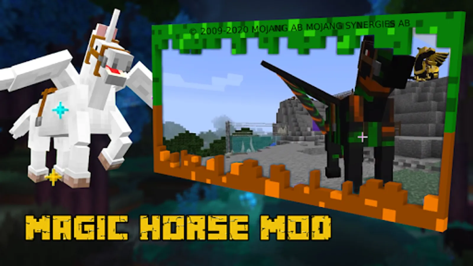Magic horse mod will add a little fairy tale to your game. Four unusual horses: Unicorn, Pegasus, Nightmare and Destroyer. Unicorns are strong animals, they can be crafted in a creative mode, and also found in a survival mode in the plains, forest biomes and other biomes, but a little less often. Than strong Unicorns are their horn and aura with an unusual effect. You can tame it, put on a helmet and use all the forces of the animal, as well as transport soft things on it, but this will become available only when you become his friend. Pegasuses are flight masters, you can find them simply by crafting in fan mode, on beach and hilly biomes, less often - relaxing in the plains and in the forest. If you ride a Pegasus, you can fly up like an iron man with the same speed. Be careful not to fall off Pegasus. The nightmare is the most dangerous, because where the nightmare sets in, fire is ignited, even in the air. A horse walks in hilly biomes on the beach, less often in the plains and in the forest. In terms of speed, even a flash does not catch up with a nightmare, and firepower not only when touched, it can also shoot balls of fire. It is smaller in size than its brothers, but much more maneuverable. The Destroyer is just a horse thug who will destroy everything in its path, they are larger and more powerful. Habitat - cold biomes such as ice plains and taiga. They destroy plants, tear leaves, trample snow, and can also destroy trees and knock anyone in their path. After familiarizing yourself with animals, remember that they can breed and inherit positive and negative traits from their parents, become bigger, meaner, kinder, more dangerous, so think first. You can also find magic wands, helmets for horses, wings, horseshoes and much more. All these items can be equipped and you will have additional capabilities. And to top it off, you can create a unique friend who will possess the parameters and qualities that you want to give him.