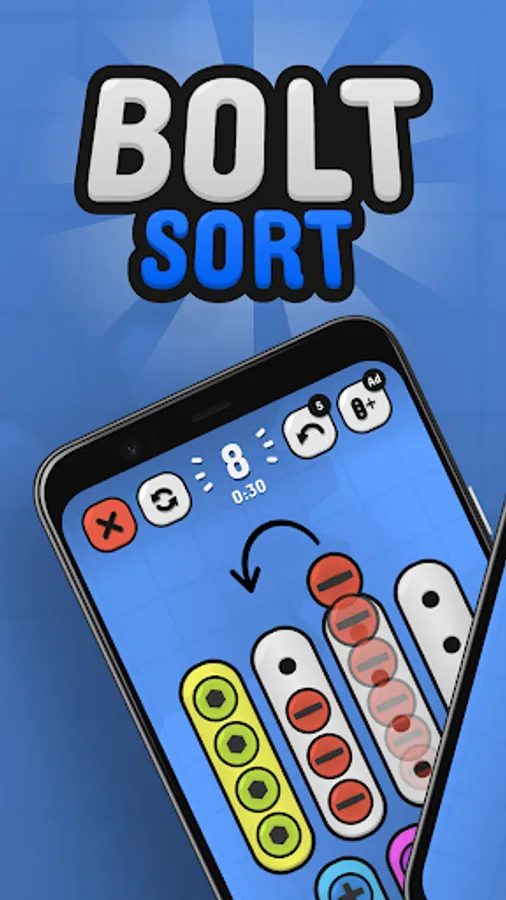 Bolt sort is a Sort Em All type color and shape sorting puzzle designed to puzzle your mind with every move. Sort each of the colored bolts into their own plates to finish each level. The amount of colored bolts to sort increases with each level making the sorting harder and harder. A challenging, yet relaxing Sort Em All to exercise and relax your mind!