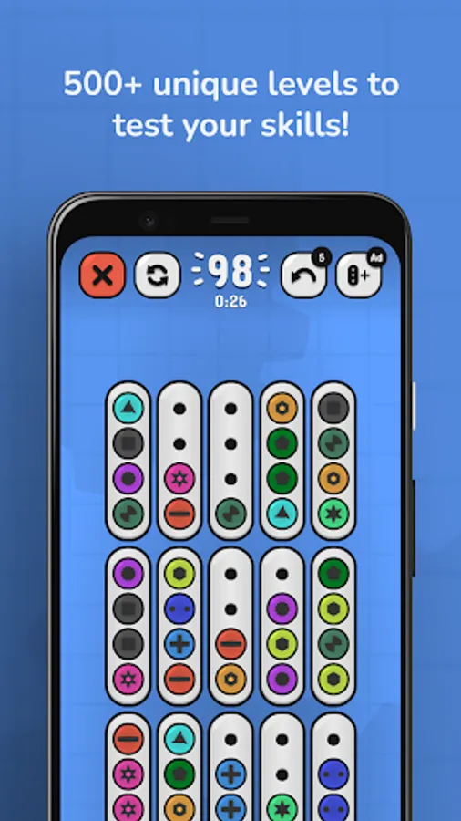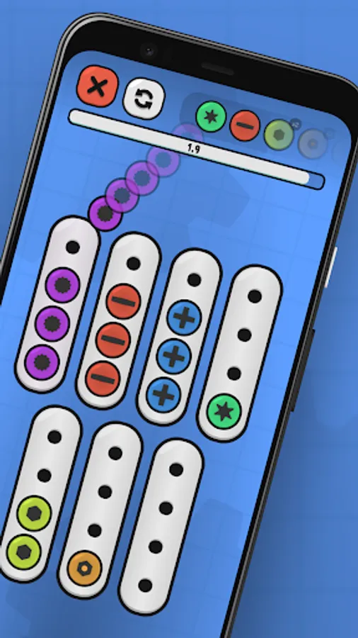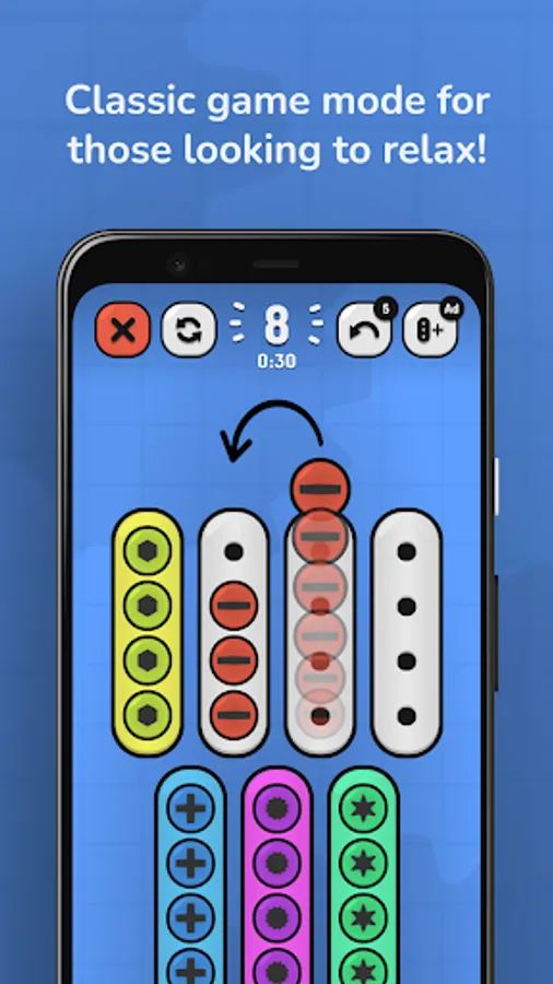 Classic game mode provides a well known Sort Em All experience where your are given an unsorted level and your objective is to sort each colored bolt into it's own plate. Once all colored bolts are sorted, the level is completed!