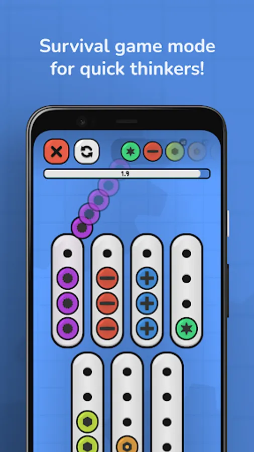 Survival game mode is a twist on the classic Sort Em All experience where you start the game with an empty level and colored bolts start rolling in quicker and quicker. Once you fully sort a plate, the sorted bolts disappear and a new set of colored bolts arrive quickly. The difficulty increases over time as new colored bolt types are added and the time to sort them is decreased.
