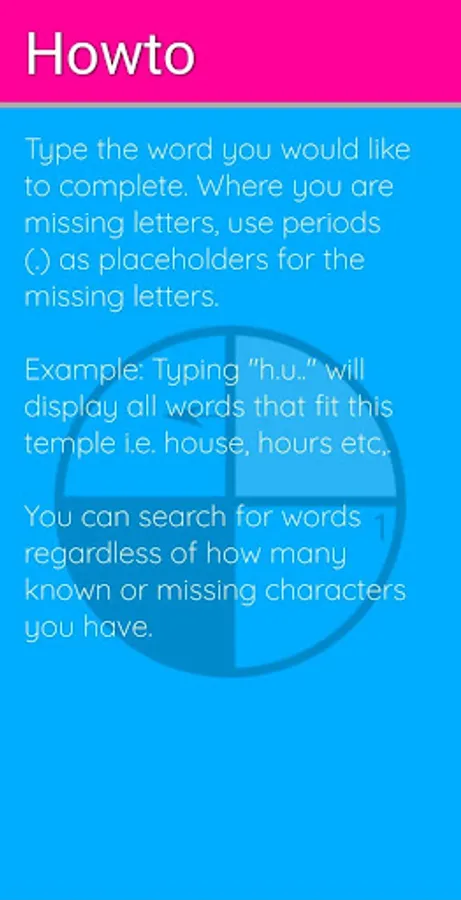 It will complete any word that fits a pattern you are searching for. For example, if you are looking for a 5 letters word and know 2 of the letters, the finder will suggest all the words that fit your search – i.e. typing "h.u.." will display all words that fit this pattern – “house”, “hours” etc,