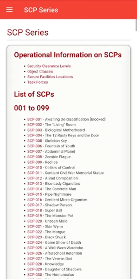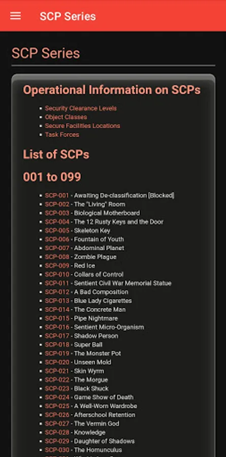 Use this app to read the main SCP series entries, short stories, joke SCP's, Mobile Task Forces, top rated SCP's, GOI's, and more. 13 languages supported (uses system language when possible).