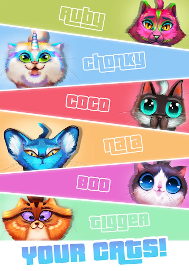 Welcome to Cute Cats! Here you can design and decorate a mansion with lovely talking cats by solving match-3 puzzles. If you think this is not fun enough, don’t worry, feed cats, dress them up and play with them, etc, we have what beyond your imagination! Come and join us now, cats are waiting for you!