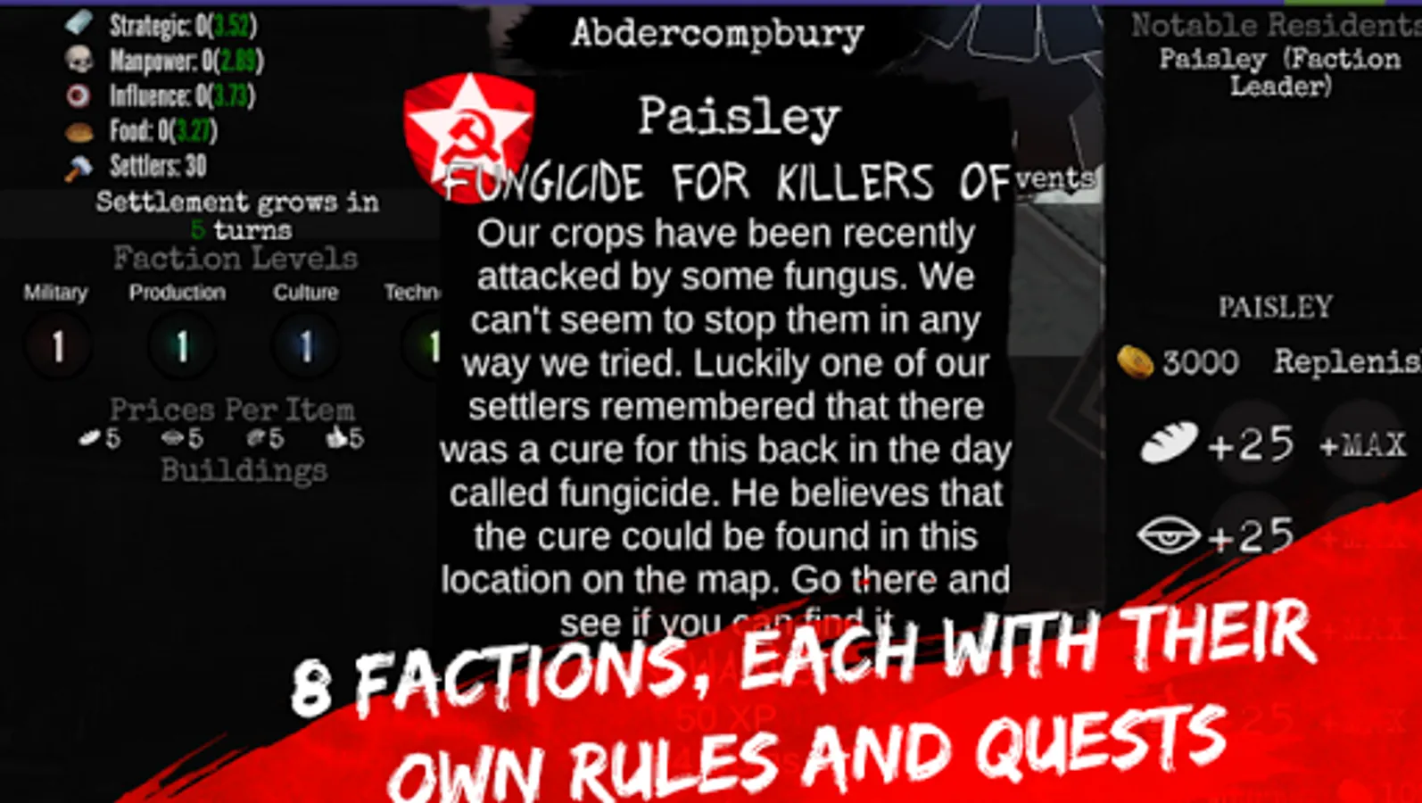 Every faction has it's own values, principles and moral standards so that means that whichever faction you might choose, they might ask you to do different kind of quests for them. Stealing from your enemies or killing them or some kind of activities that were once deemed illegal would not be pursued by the religious faction. Instead they will be looking for ways to influence settlements to their cause. With permadeath and 8 factions and each with their own way of doing things the game offers ton of replayability.
