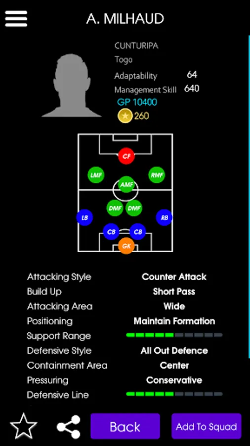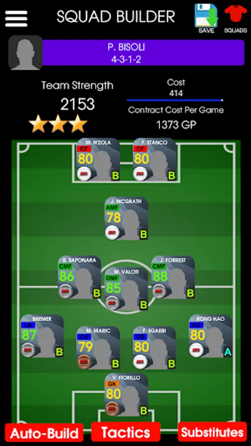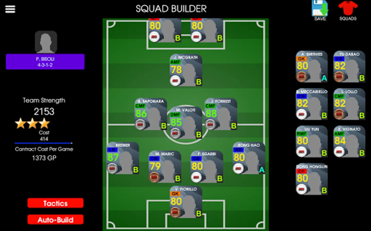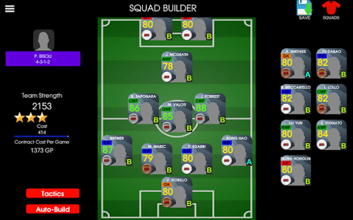Build squads using players from the player database. The squad builder calculates team strength, ideal for building 2, 3 and 4 star teams. Squad builder also calculates the full teams contract renewal cost per game, allowing you to learn and understand how to build a squad with high team strength and low contract cost.