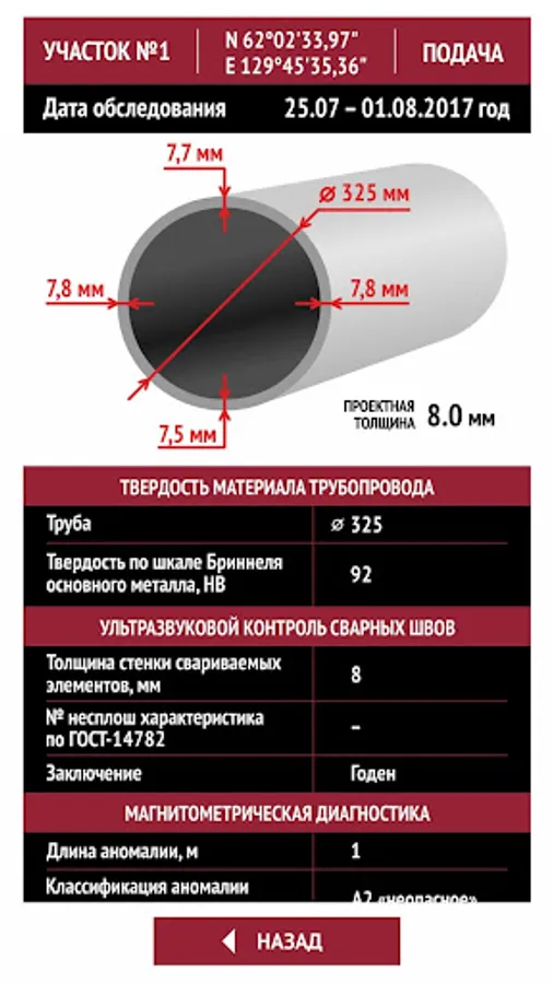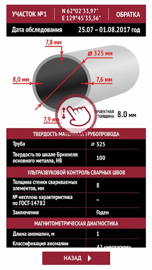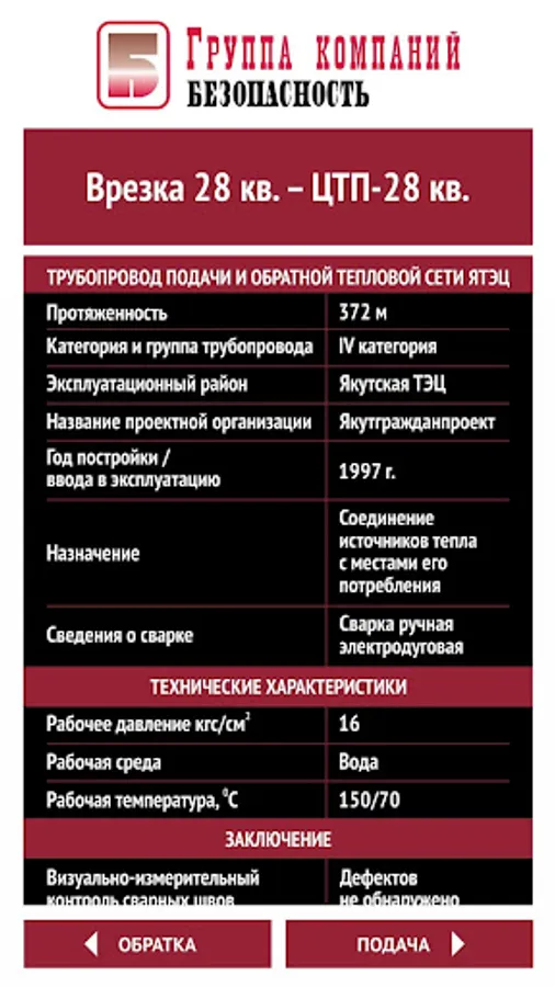 Information support of examination of objects with the use of augmented reality technology. The possibility of providing around the clock access to information about objects: the date of the checks, the launch date of the facility and other information, the staff of the operating organization and the organization performing control functions for the system.