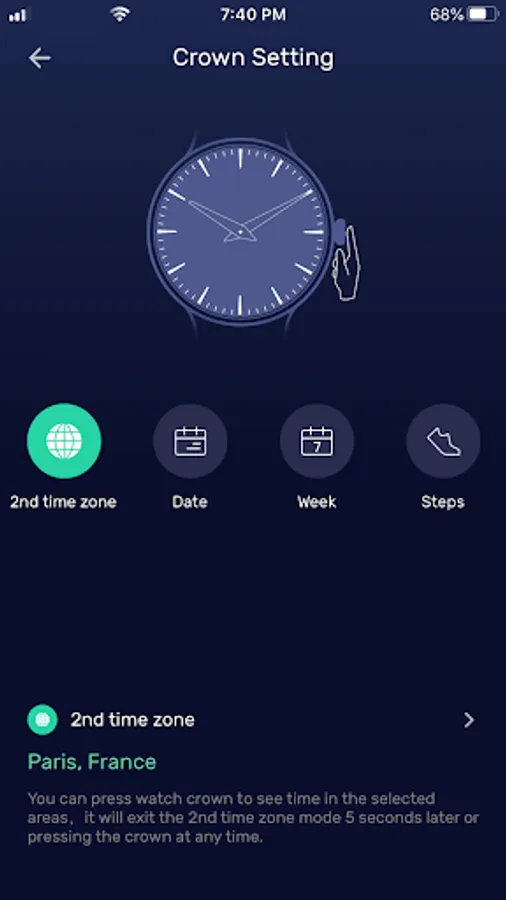 Conveniently display a second time zone with a push to the crown.