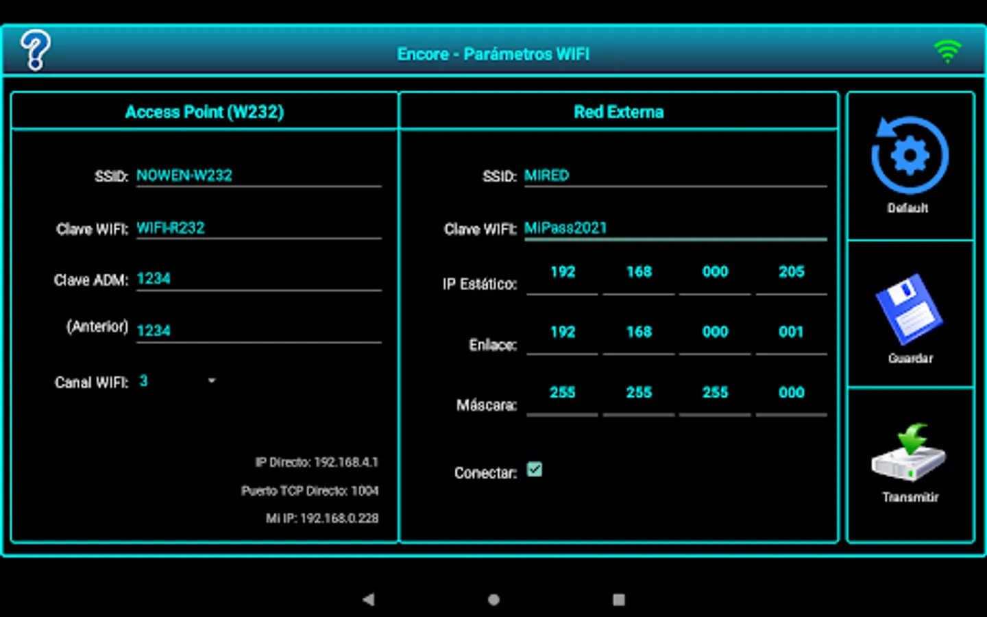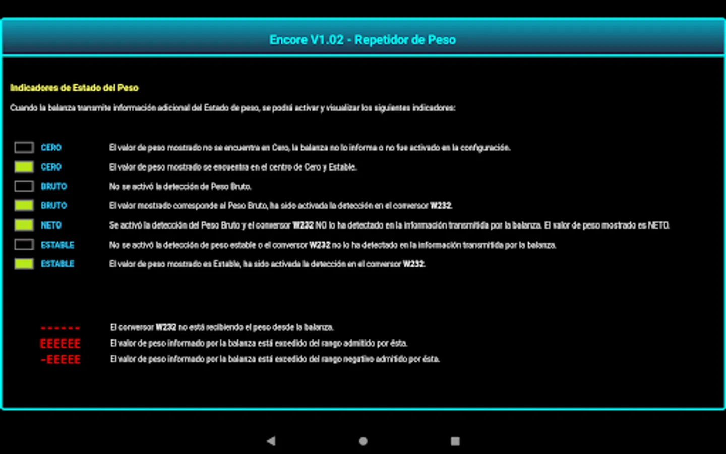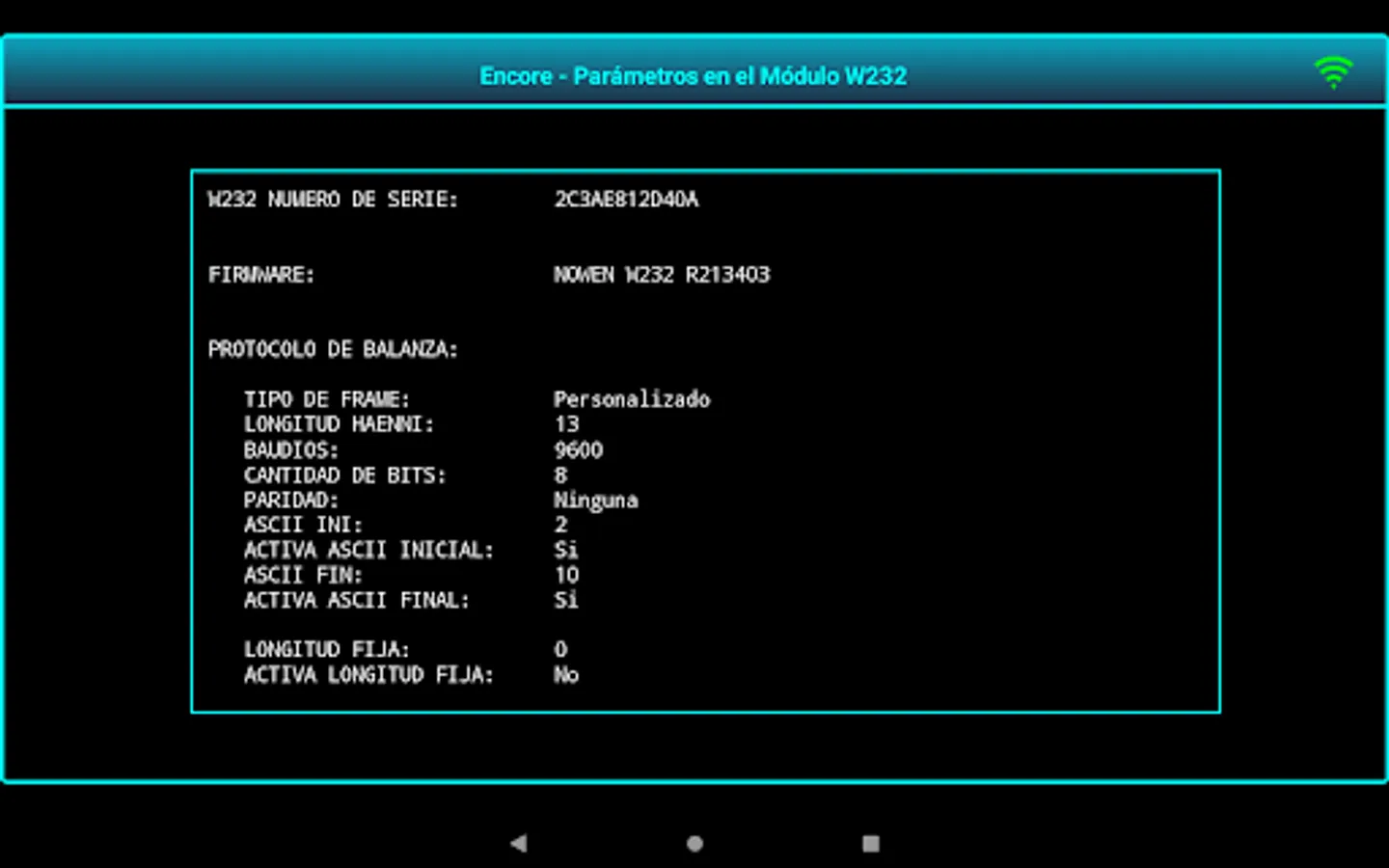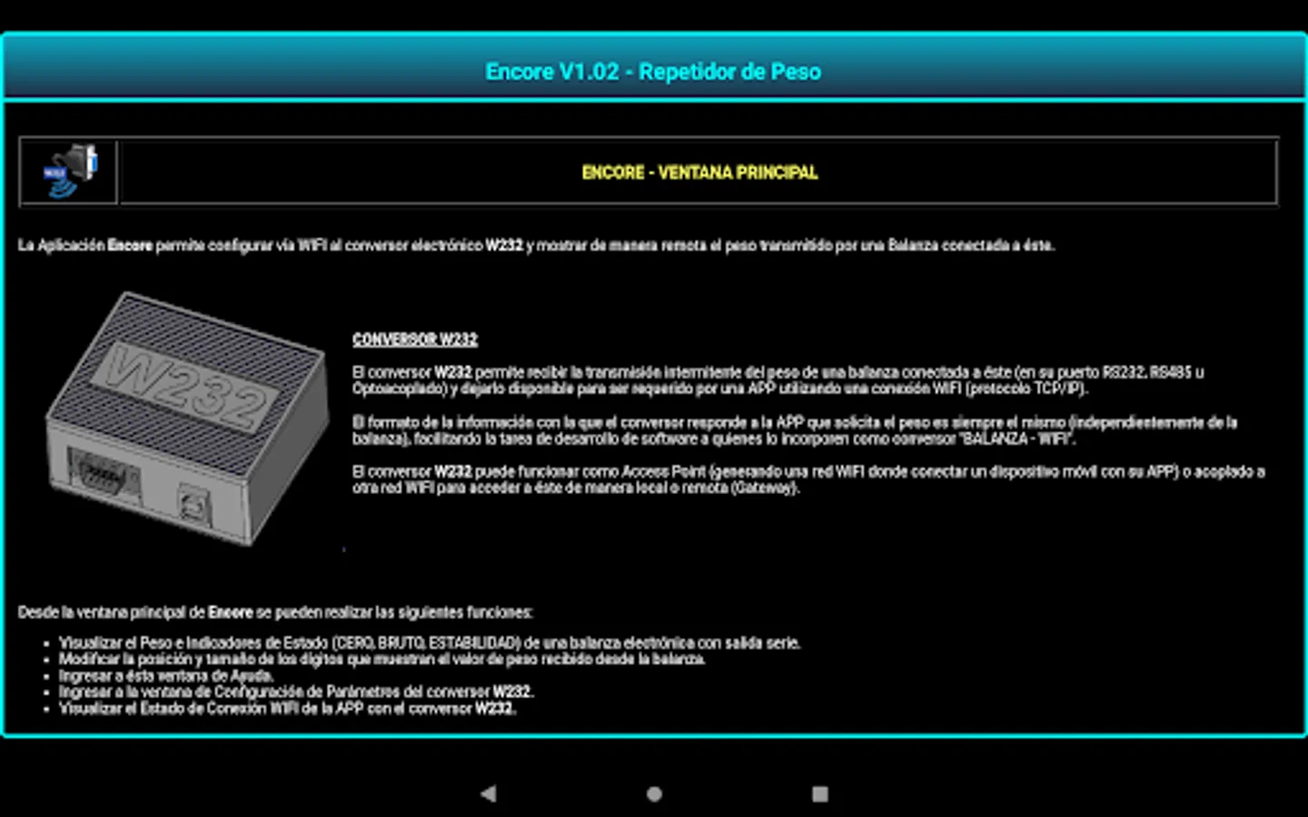 "Encore" is an Application created to configure operating parameters of the NOWEN brand W232 converter module and show the weight transmitted by the scale connected to it (Weight Repeater) or the format of its data string.