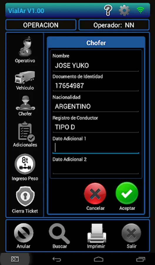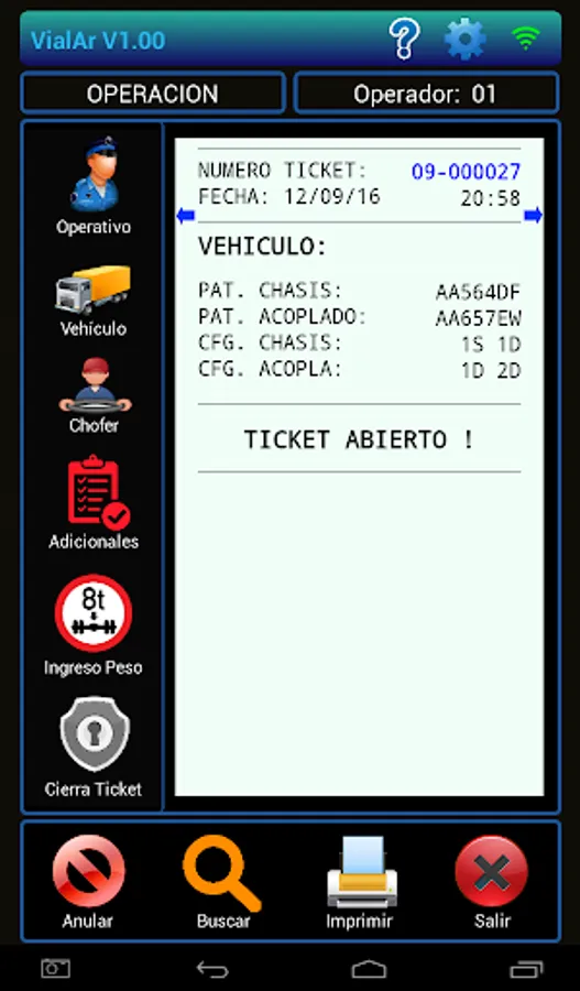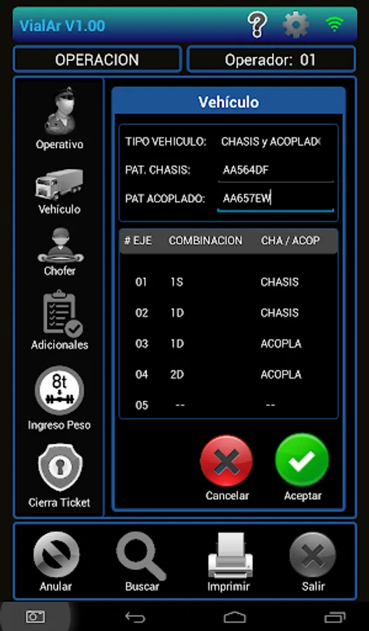 The APP supports optional data entry Operating Control if it is performed by a state agency, vehicle data (patents and axis configuration) Drivers and additional data that may be required.