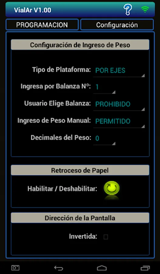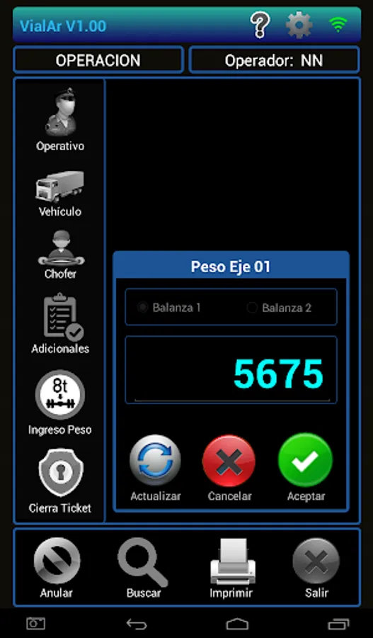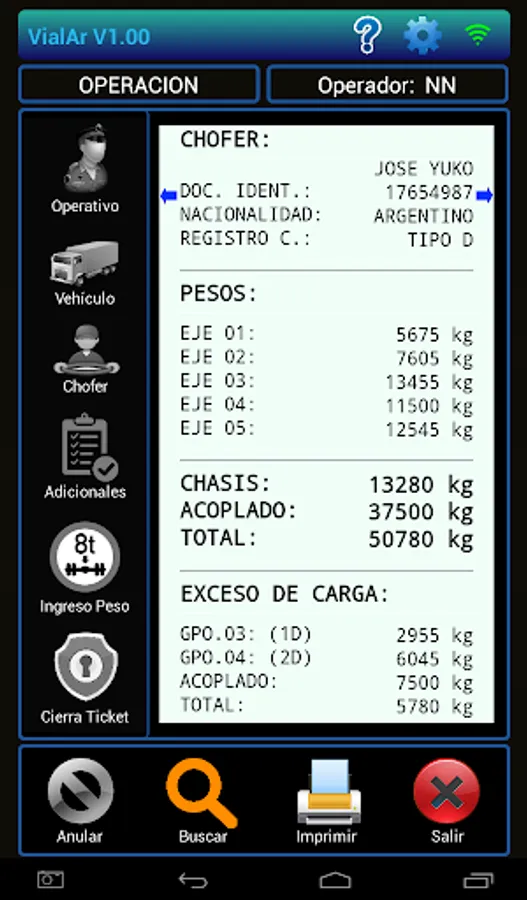 In conjunction with the nowen printer model Ñandú connected to a scale for weighing axle, the APP Vialar to define the axis configuration that owns the vehicle and income weight of each to determine if it complies with the maximum values permitted by law Roads Authority of each country.