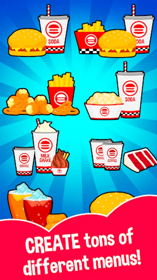In this idle game there are more than 45 types of burger menus (including beautifully drawn cakes, doughnuts, fries, ice cream and hamburgers) to unlock!