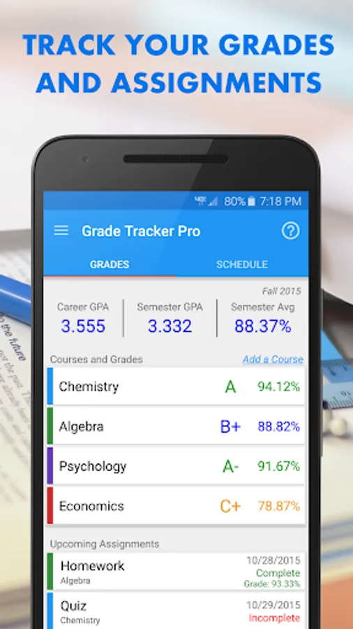 Track your Grades, plan your Assignments, and manage your Schedule through multiple semesters, complete with robust GPA calculation, custom grading scales, and more!