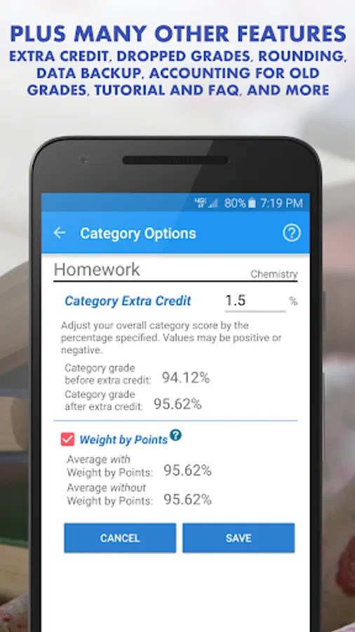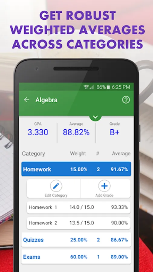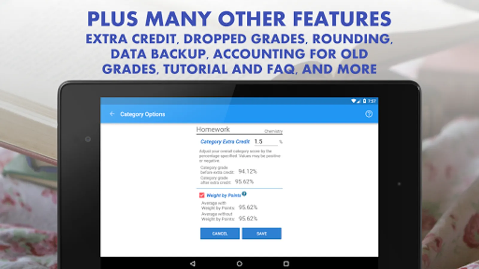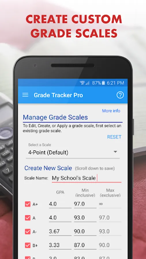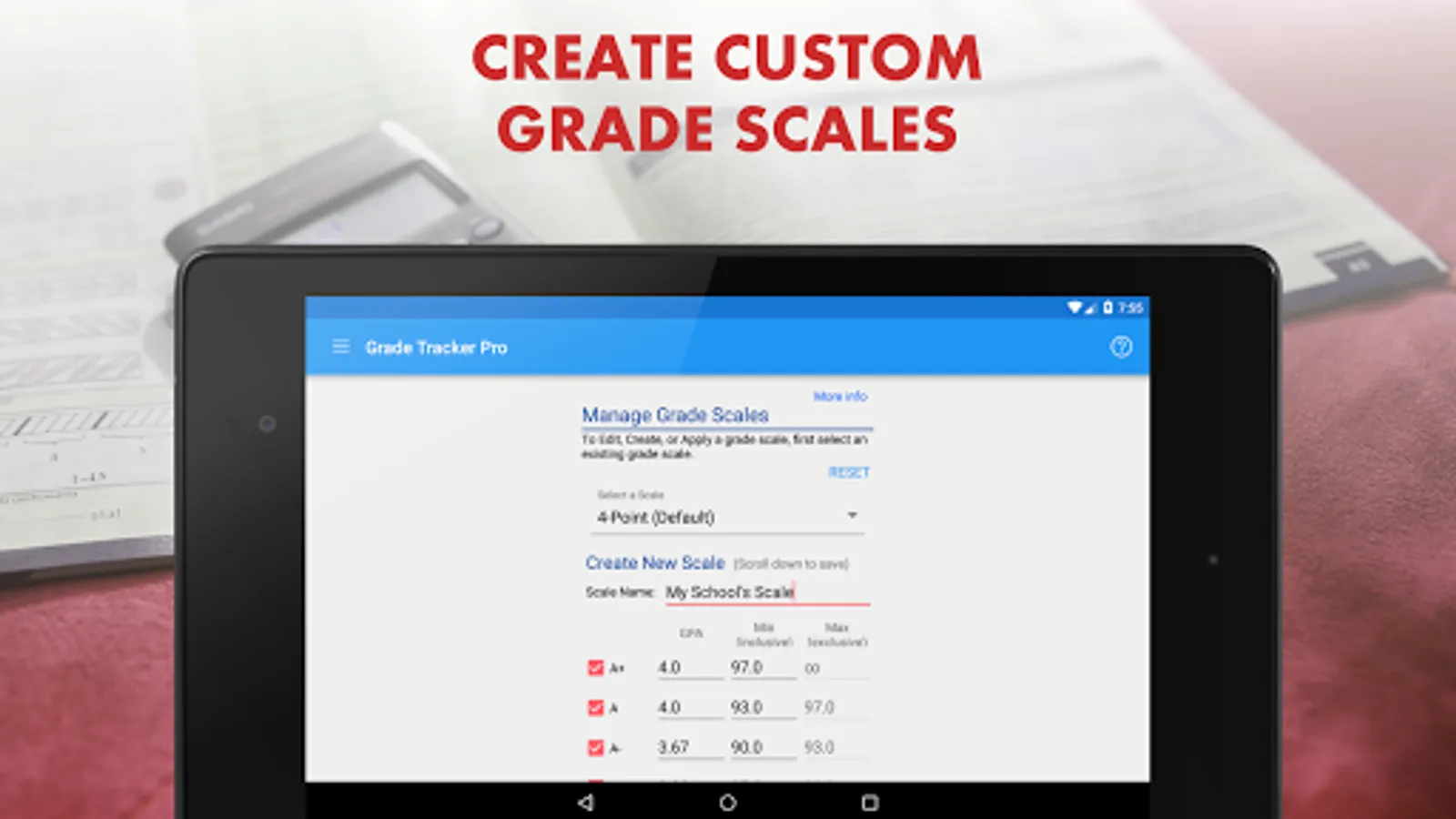 ► Custom Grade Scales -- Choose from 4 default scales or create your own for letter grades and GPA!