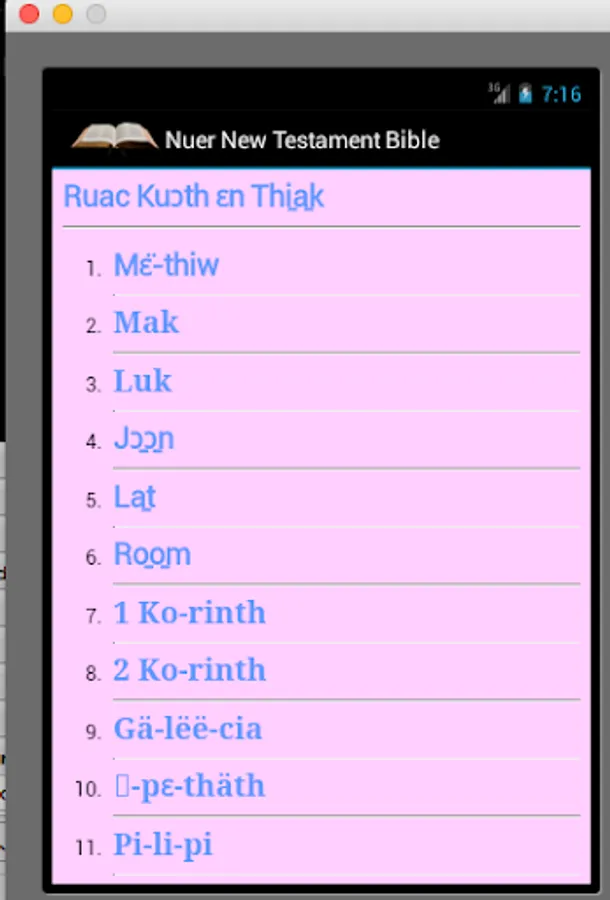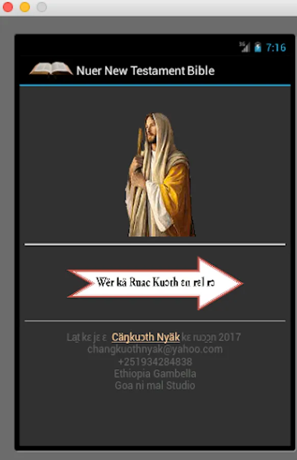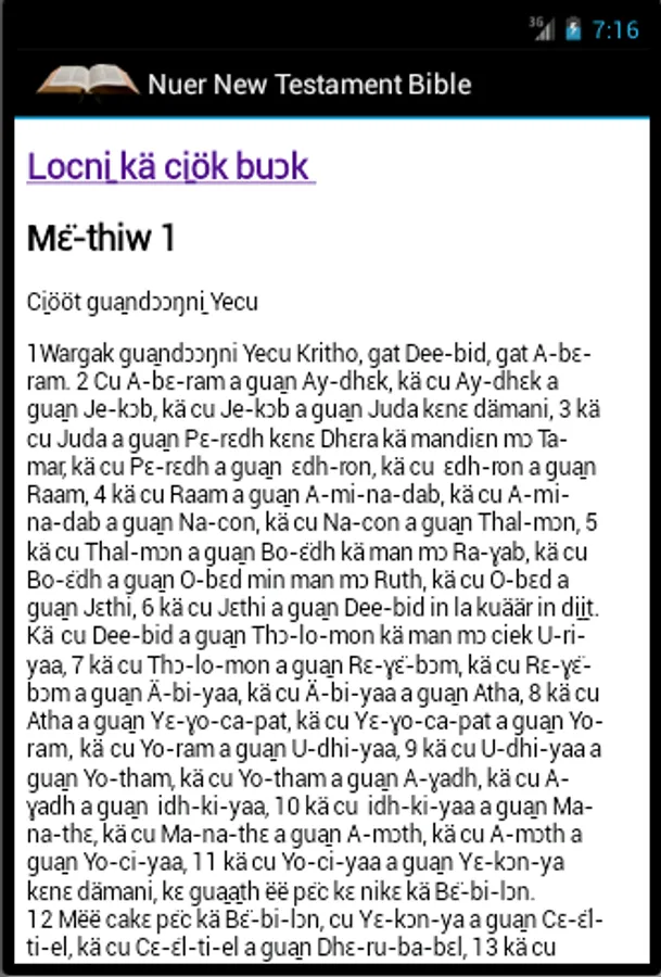 its an English New Testament Bible which was translated into Nuer Language and developed into android app by changkuoth Nyak in 2017 to helps Nuer community in order to easily access Nuer New Testament Bible on their smart phone. May God bless the Reader. Bi̠ Kuɔth yiɛ poth yiɛn diaal.