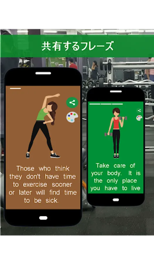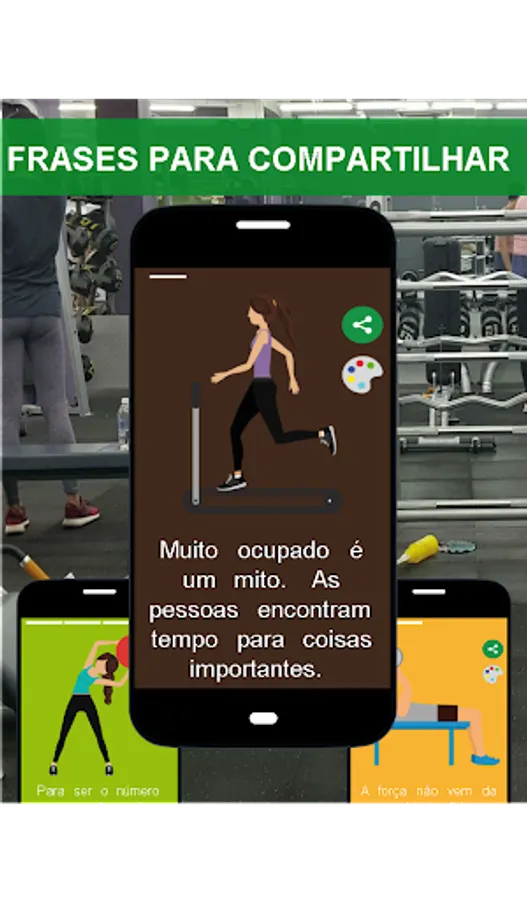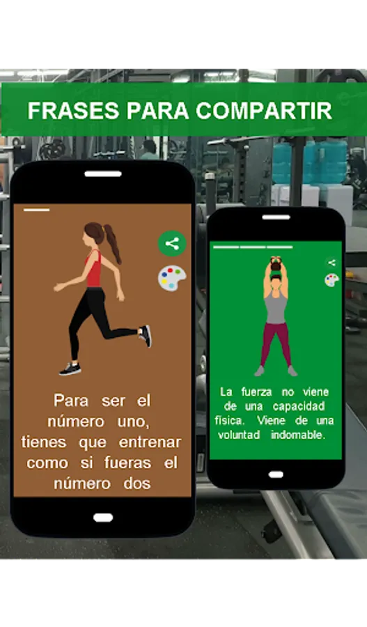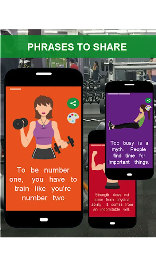 Share the fitness phrases with images through your favorite social network: WhatsApp, Twitter, Facebook, Instagram, Tictoc, etc.