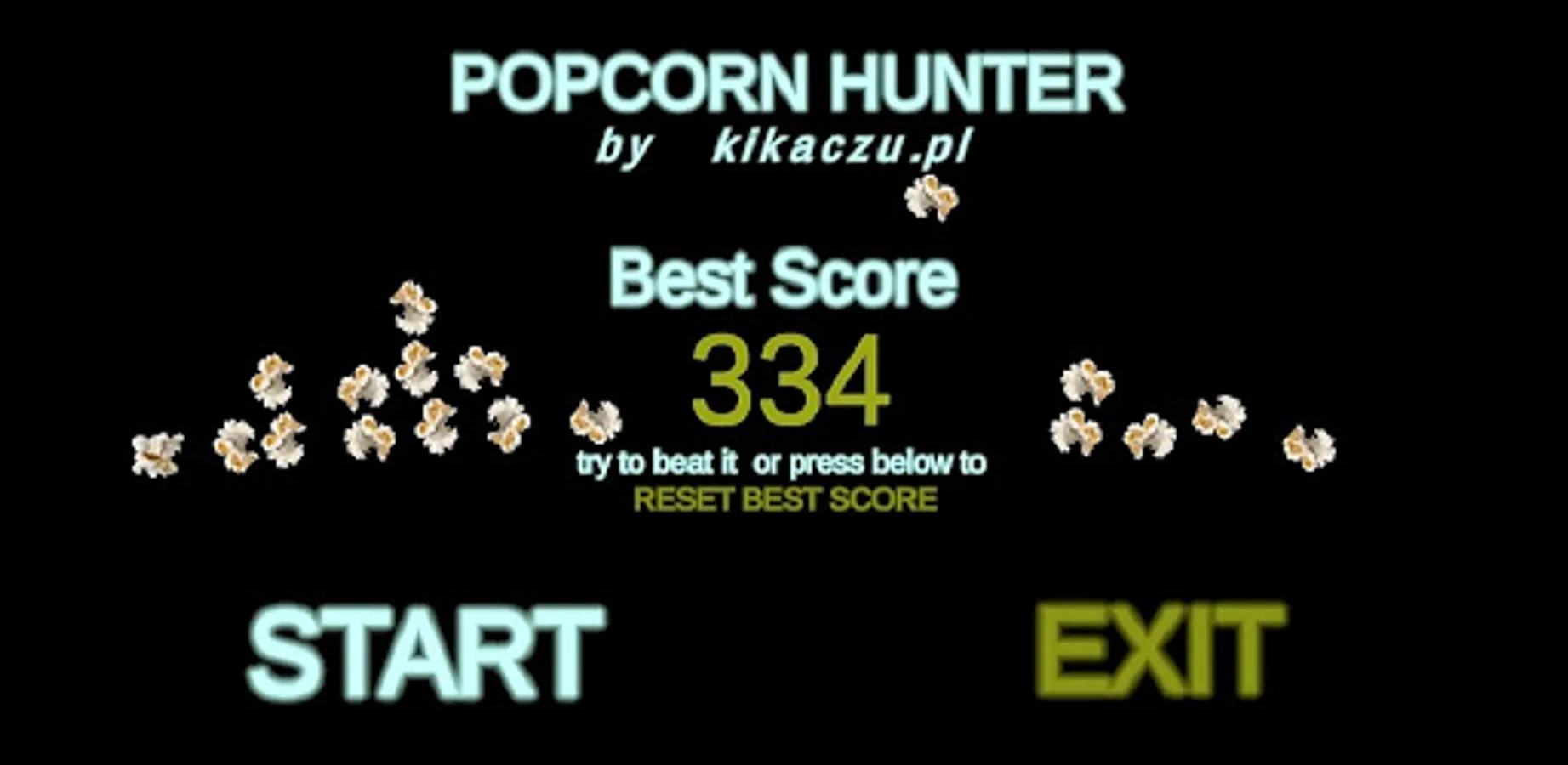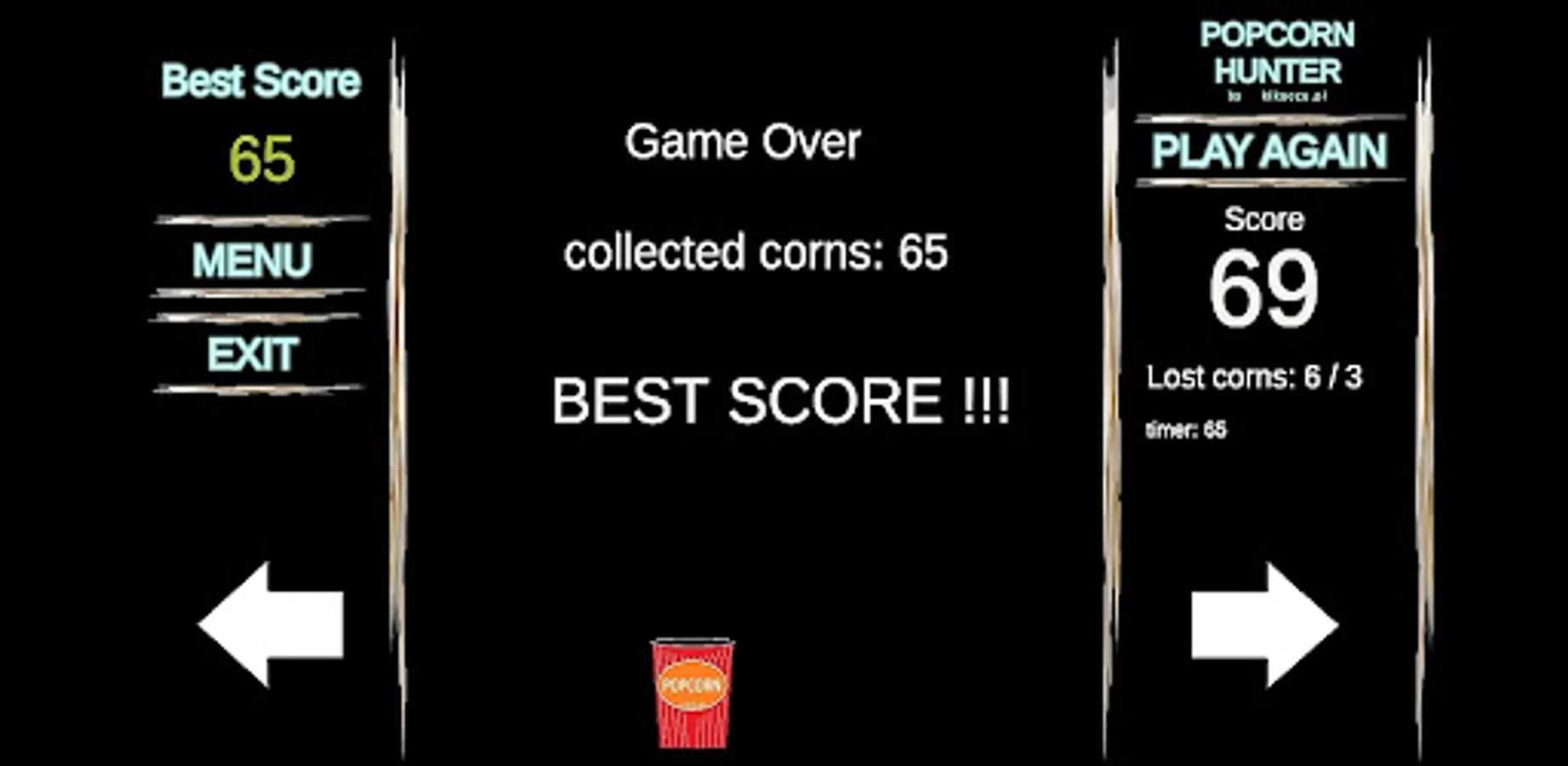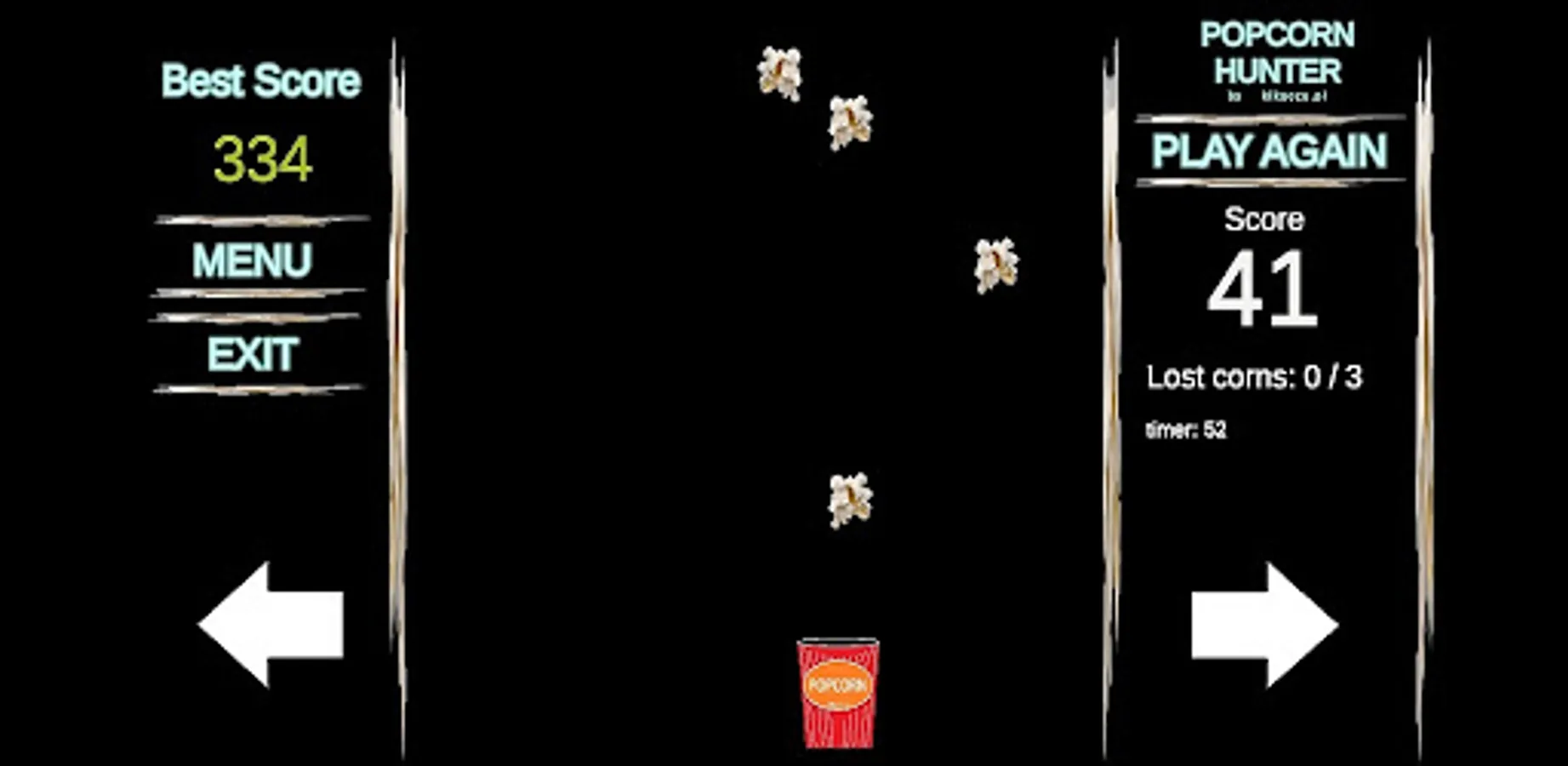 Pressing LEFT and RIGHT arrows on the screen you are moving cartoon box. Catch falling popcorn to cartoon box and got the score. Game is over after lost 3 corns. Best Score is stored to keep your achievements and make you possible to improve it. Good Luck and Enjoy !