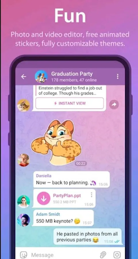 FUN : It has has powerful photo and video editing tools, animated stickers and emoji, fully customizable themes to change the appearance of your app, and an open sticker/GIF platform to cater to all your expressive needs.