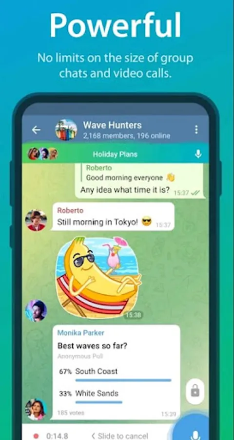POWERFUL: You can create group chats with up to 200,000 members, share large videos, documents of any type (.DOCX, .MP3, .ZIP, etc.) up to 2 GB each, and even set up bots for specific tasks. Nxt Gen is the perfect tool for hosting online communities and coordinating teamwork.