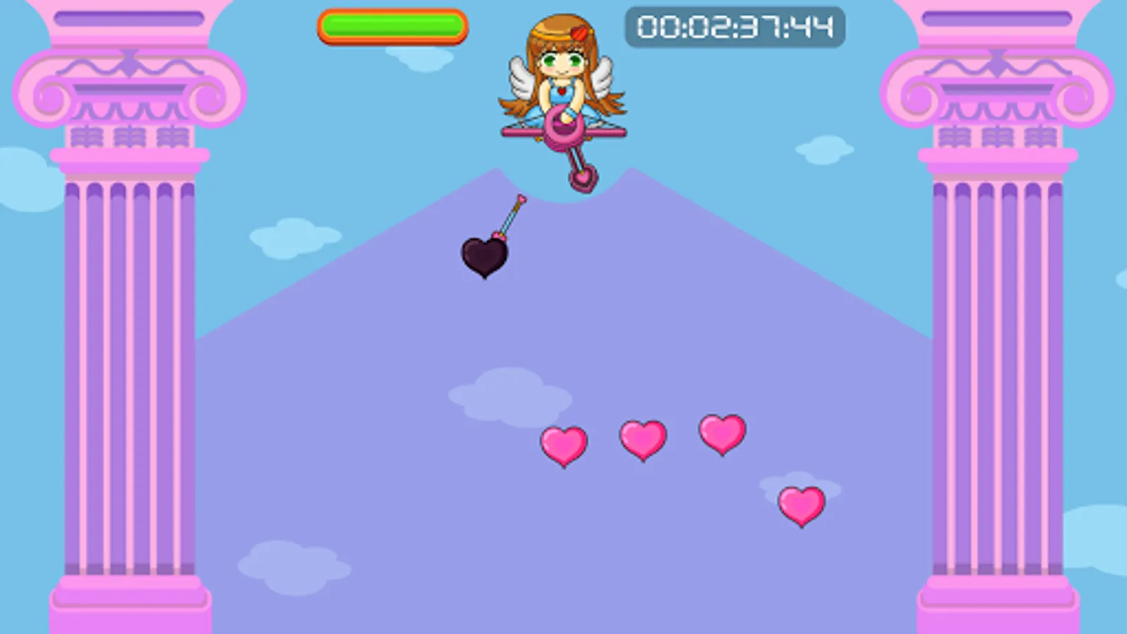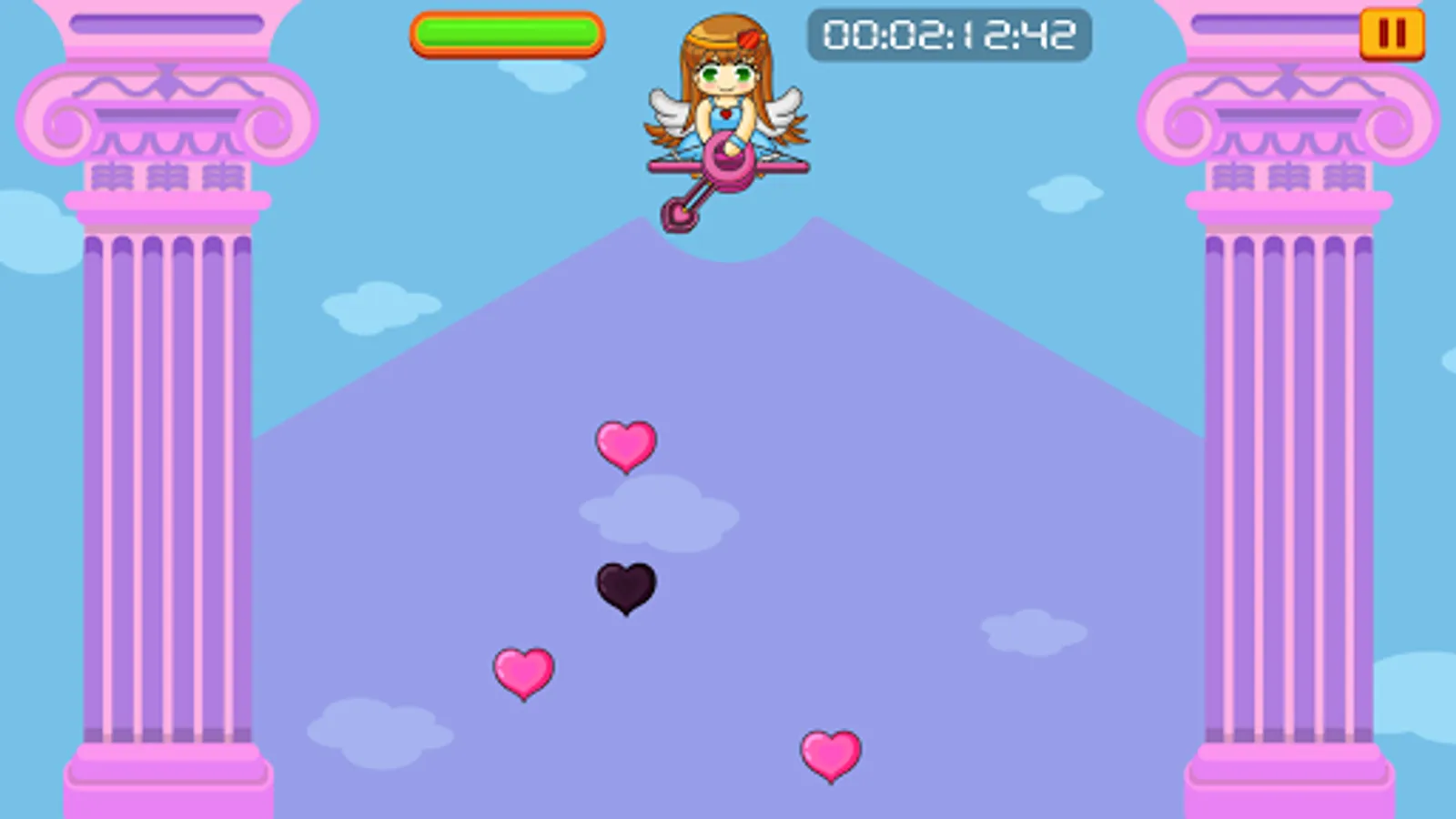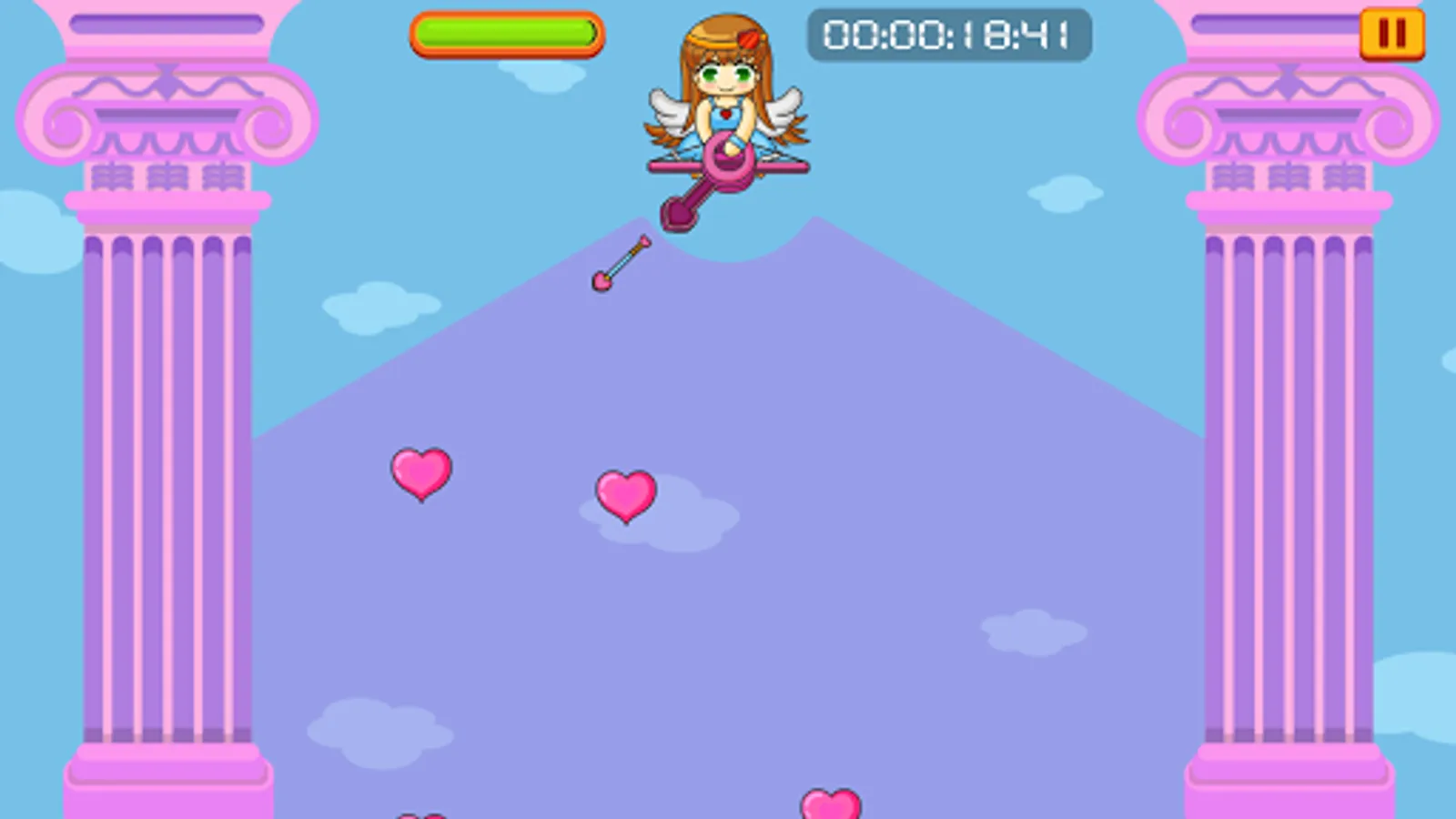 • Vivi’s bow will automatically rotate within a 120-degree arc. Tap anywhere on the screen to fire love arrows when the bow is aimed at any pink hearts floating up from below the screen. Do be aware that arrows take time to travel across the screen, so timing is important. The bow also takes a short time (0.75 seconds) to charge up after firing a shot.