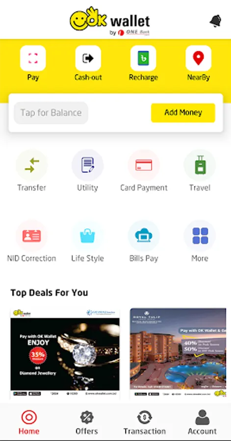 It’s Easy! Download OK Wallet App from Google play store or iOS App store and register online with your NID and other information. Or simply visit nearest ONE Bank branch or OK Wallet agent point with valid photo ID (NID/Passport) and a copy of lab printed colour photograph.