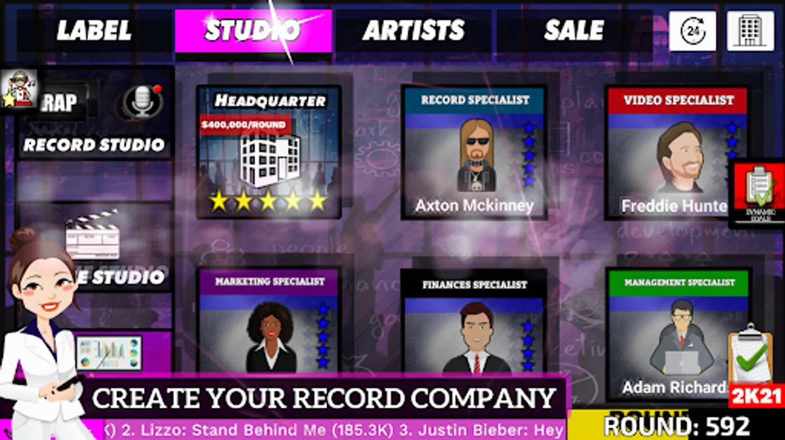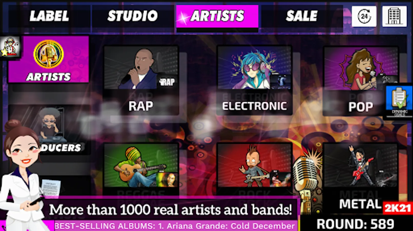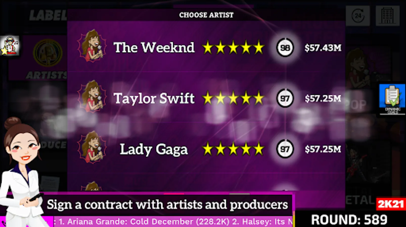 MusicLabelManager is a music industry simulator that allows players to create and run their own record label. Players take the role of CEO and try to make their mark on the music industry. The game has a database with more than 1000 real artists with stats for 2021. Music awards, singles, concert tours, streaming services and much more!