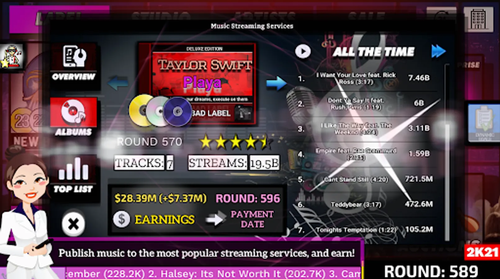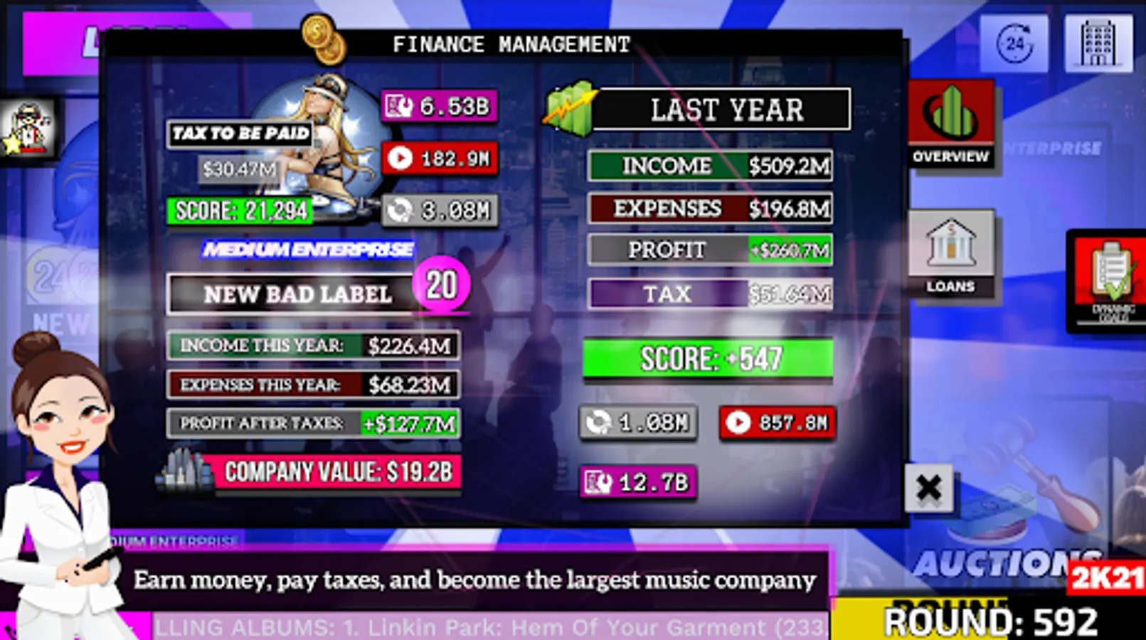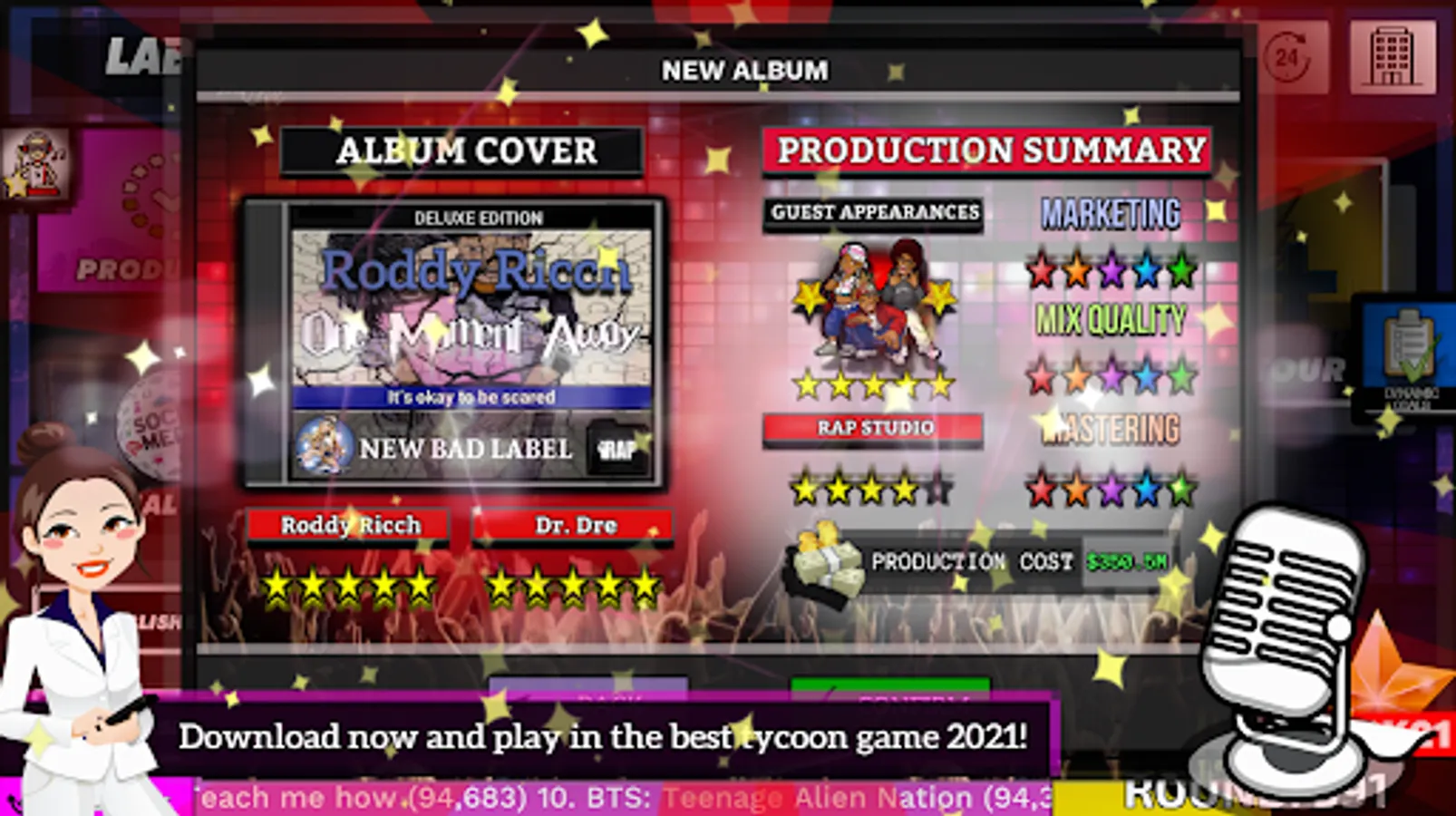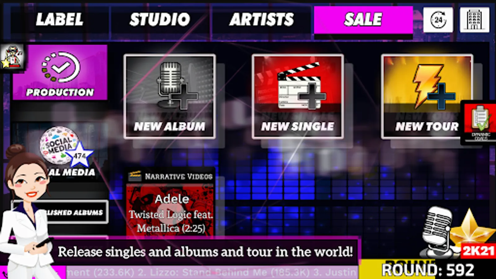 MusicLabelManager is a music industry simulator that allows players to create and run their own record label. Players take the role of CEO and try to make their mark on the music industry. The game has a database with more than 1000 real artists with stats for 2021. Music awards, singles, concert tours, streaming services and much more!