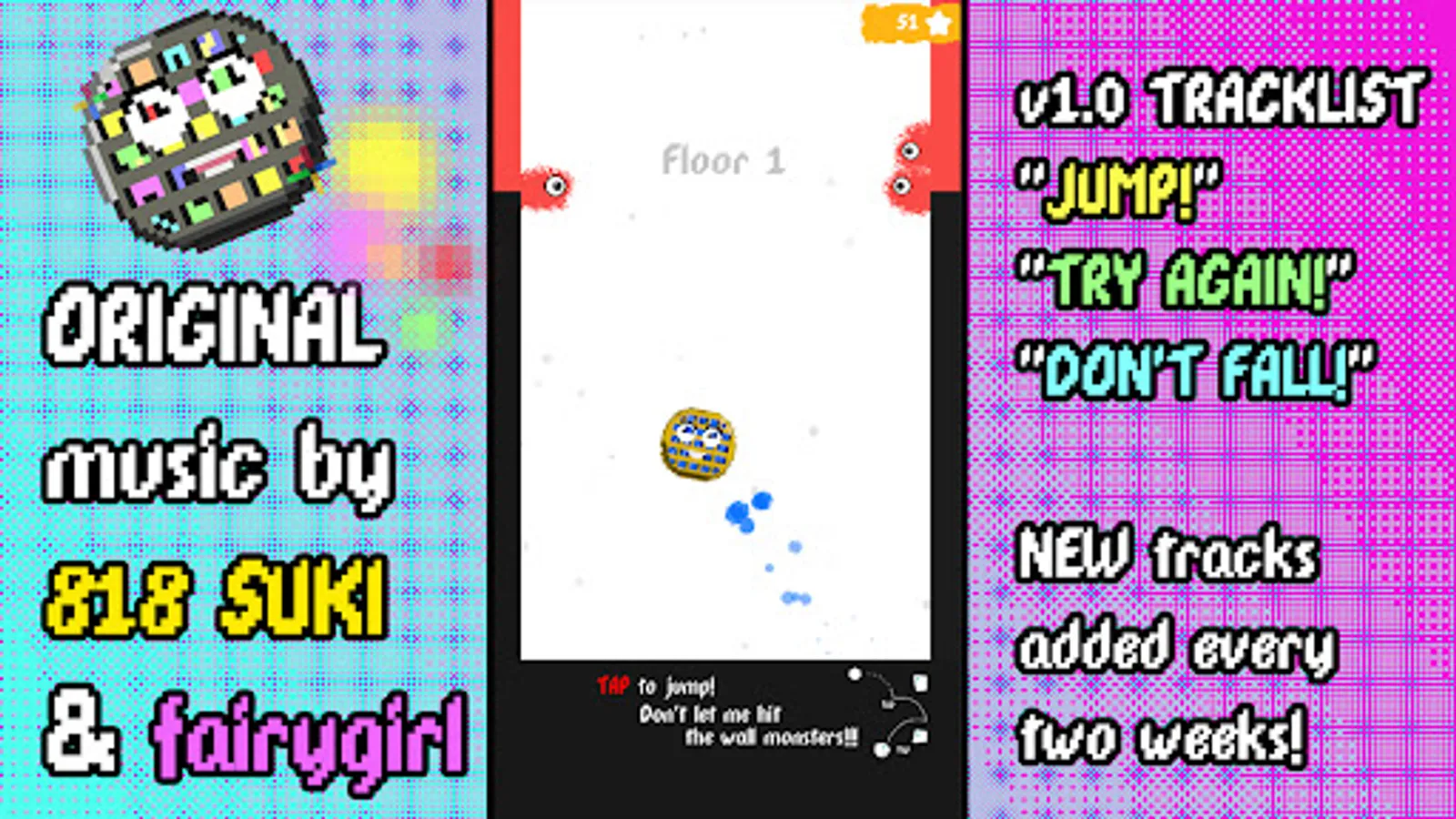Endless gameplay with the dopest Pixel Art characters! Avoid hitting the fuzzy wall monsters and jump as high as you can!