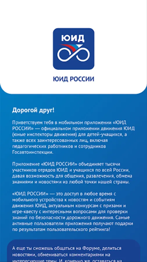 The mobile application "YUID RUSSIA" is the official application of the YUID movement (young traffic inspectors) for children-students, as well as all interested persons, including teachers and employees of the State Traffic Inspectorate.