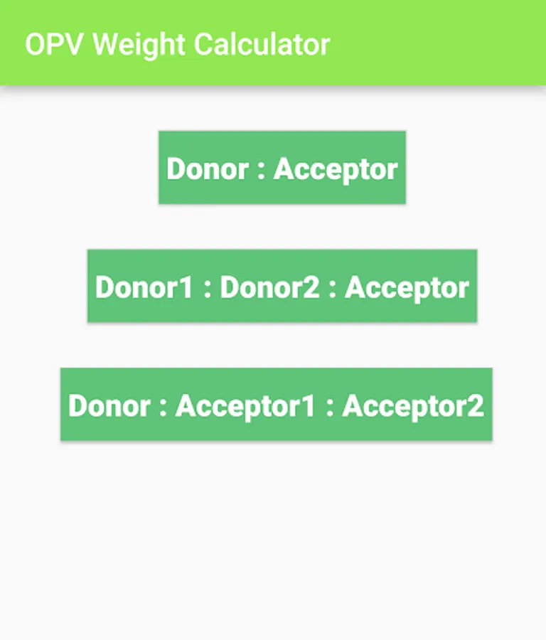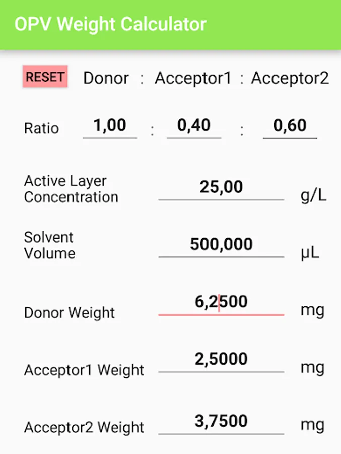 This application calculates the weight of the Donor (D) and Acceptor (A) material(s) for specific D:A weight ratios, active layer concentration and solvent volume. There are three modes of operation: ‘Donor:Acceptor’ , ‘Donor1:Donor2:Acceptor’ and Donor:Acceptor1:Acceptor2’.