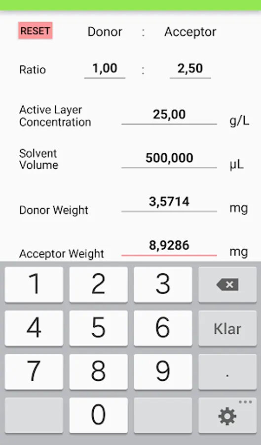For each of the modes, the user defines the desired weight ‘Ratio’ between the Donor(s) and the Acceptor(s) materials followed by the ‘Active Layer Concentration’ (in g/L-1) and the ‘Solvent Volume’ (in μL). The program instantly calculates the resulting ‘Donor/Acceptor Weight’ values of the corresponding material (in mg). All fields are editable and reciprocal according to the following logic: