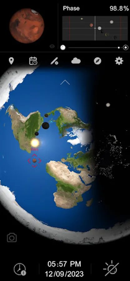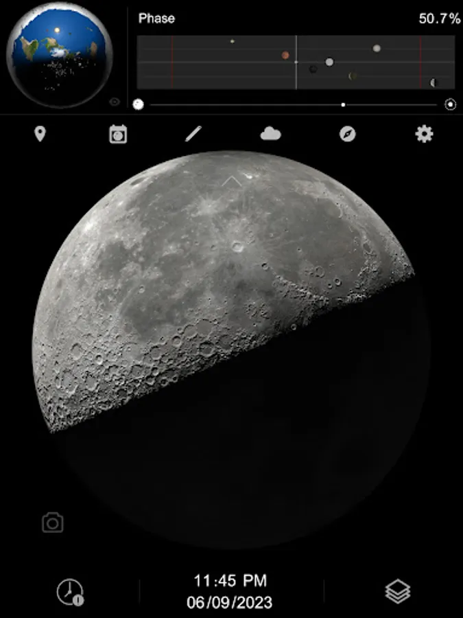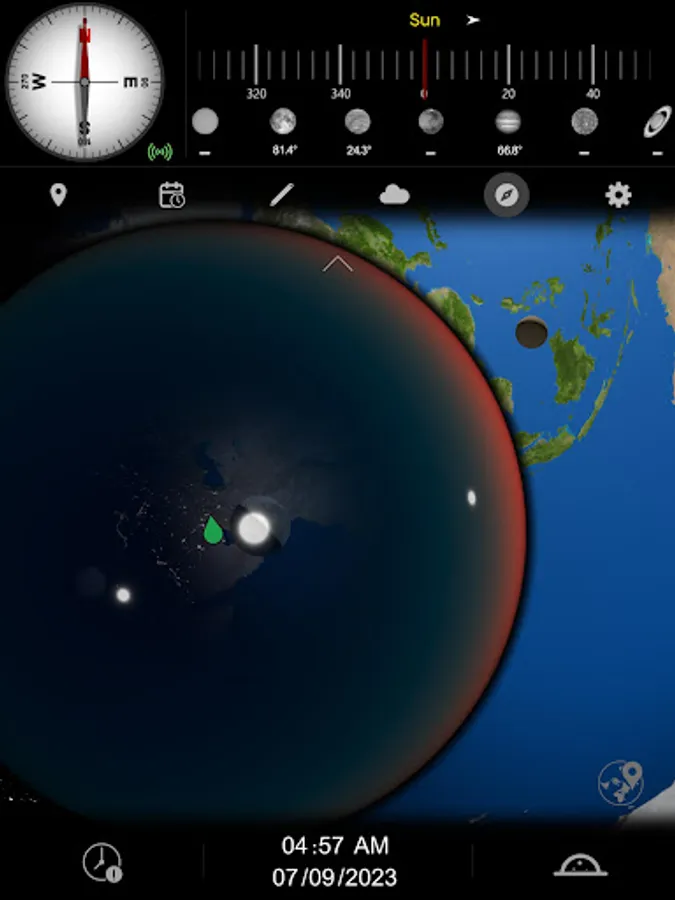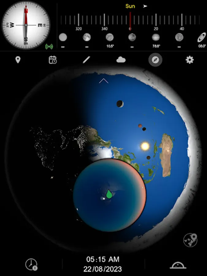 Once you start the application, you will be immediately informed about time, the current overhead position of the sun and moon, the current phase of the moon and more. With one touch you can rotate clockwise or counter clockwise to move time to the future or to the past and see where the sun/moon should be or how moon phase changes according to the change of time, or you can pick any date and time and get all of the relevant information of that date and time . Also you can set the app as a live wallpaper if you don't want to run the app every time, You can take a capture and save it on gallery or share it with a friend.