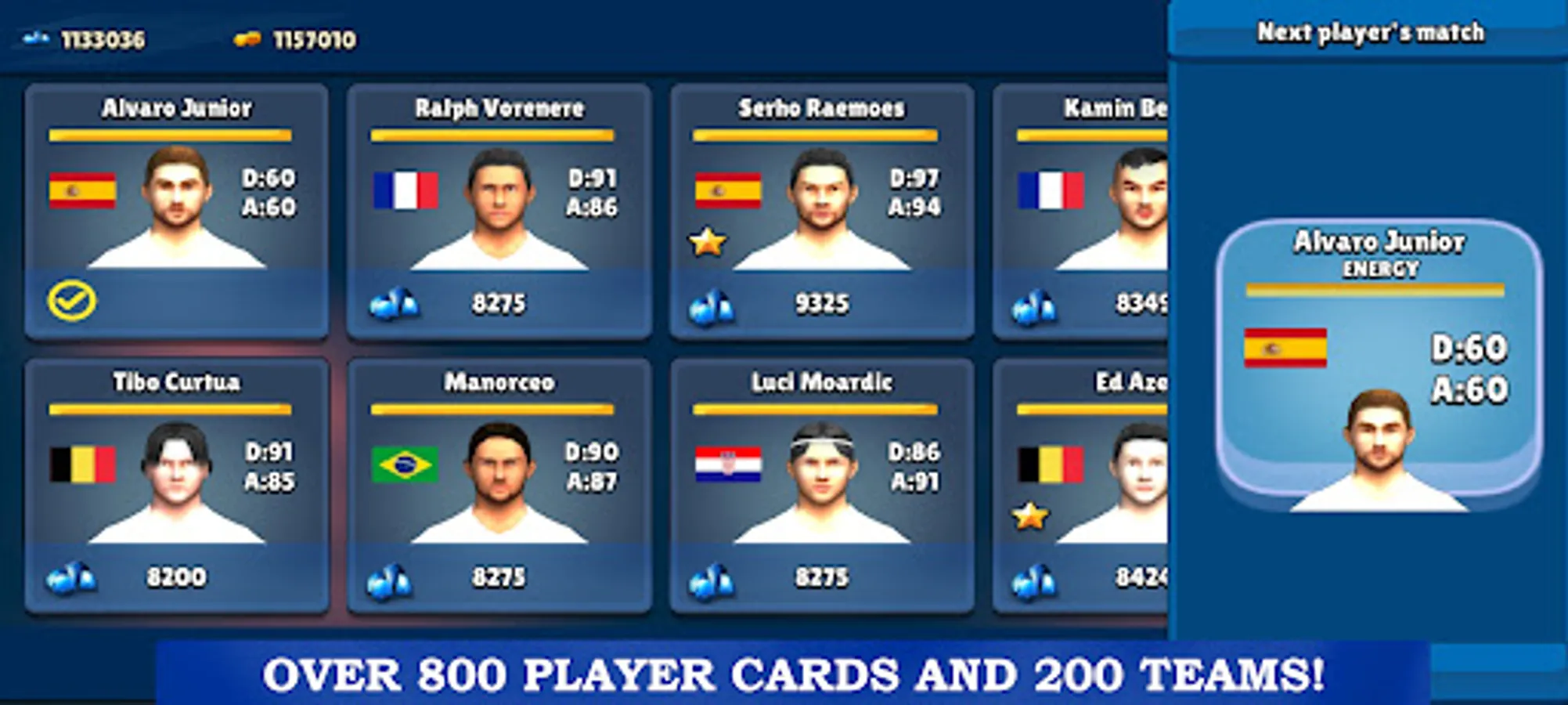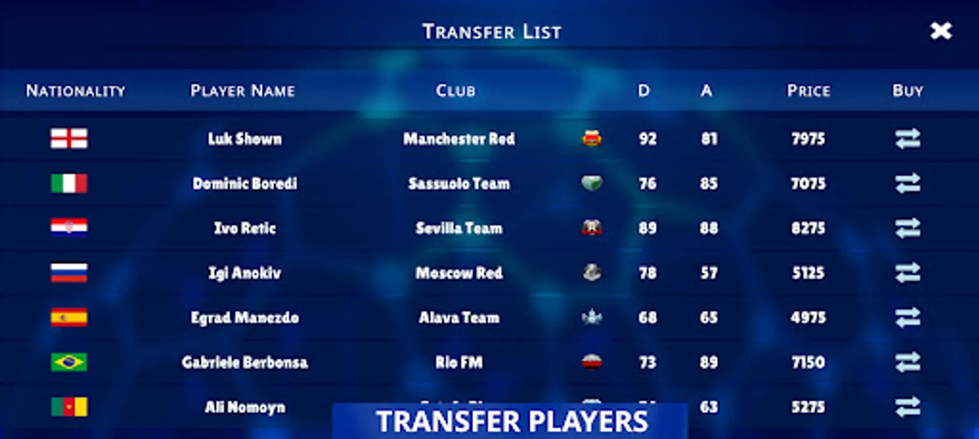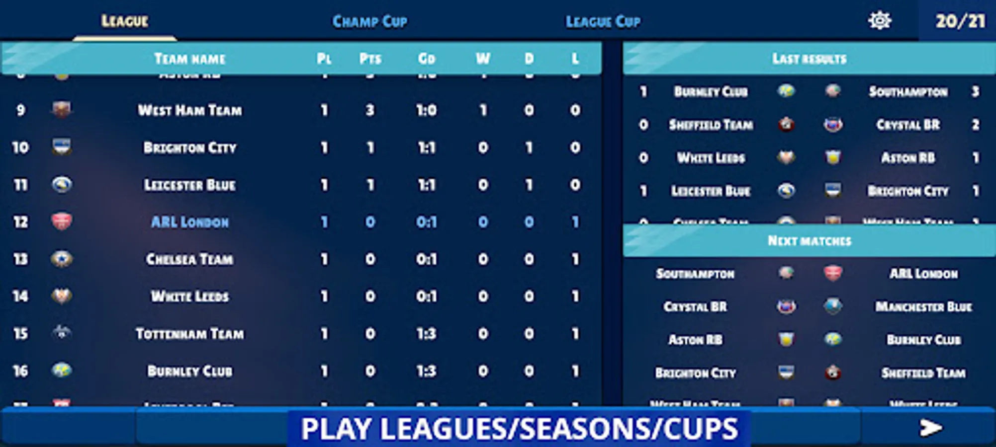 - tournament mode with group and knockout stages (Champ Cup, America Cup, Euro Cup, World Cup, League Cup)