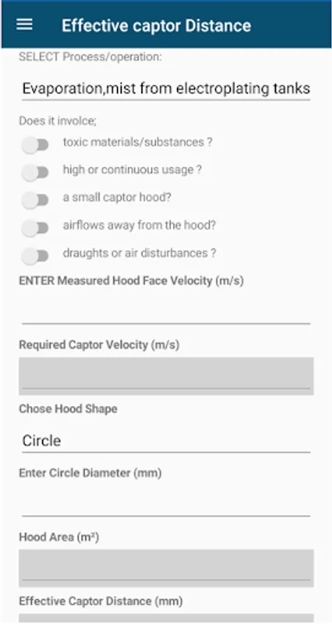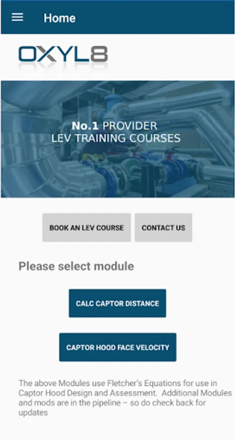 This OXYL8 App module will calculate Hood Entry Velocity requirements for Captor Hoods (using Fletchers Equations). Additional modules and modifications are in the pipeline – so do check back from time to time for the latest version. Contact us via the OXYL8 web site with your requests for additions to the modules – or indeed if you have any other suggestions or if you spot any errors.