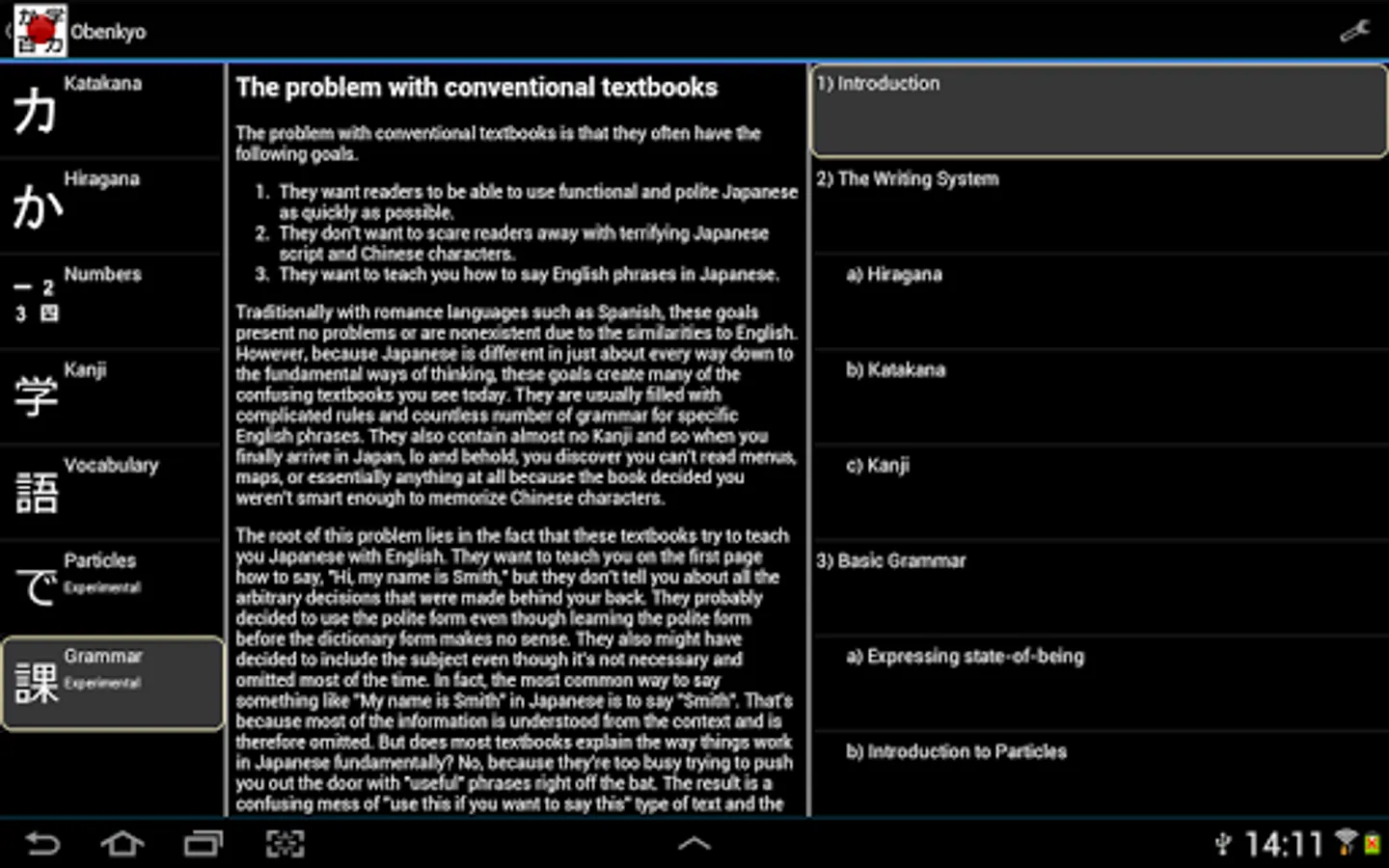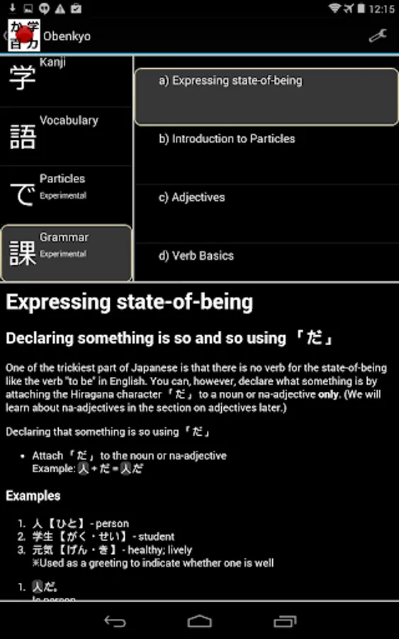 - Experimental gramatical particle test (around 100 sentences from project Tatoeba) central to japanese language.