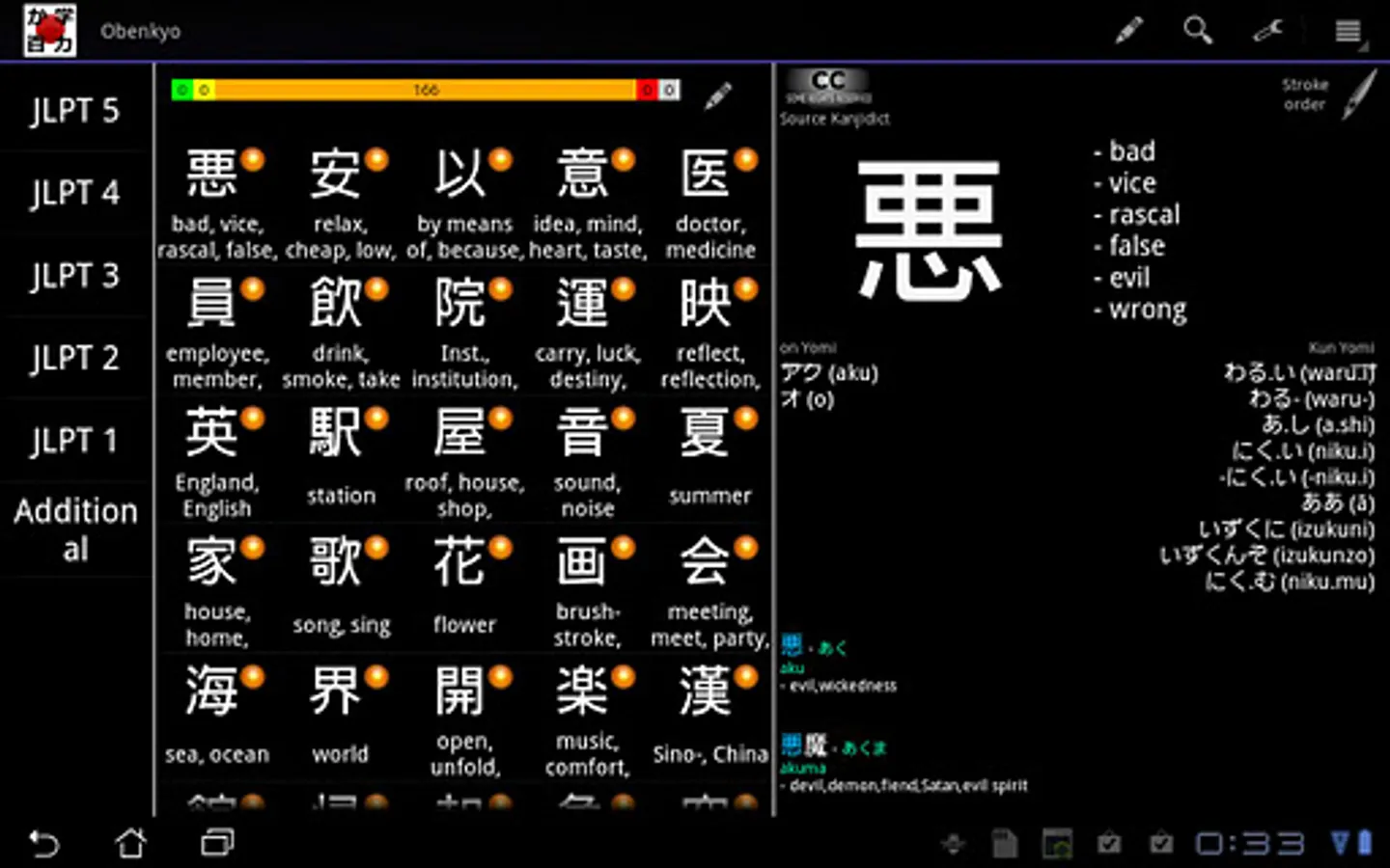 - 2300+ japanese kanji's (level 1-5 JLPT or Jouyou 1-7) with stroke animation (source KanjiVG), translation, readings (Source KanjiDict) with flash card and drawing game.