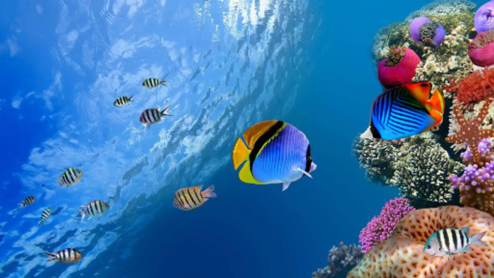 Ocean Fish Live Wallpaper offers you gorgeous animated backgrounds of colorful and exotic ocean fishes swimming in deep blue water. All the magic of these sea creatures can now be at your fingertips with this beautiful live wallpaper fish pictures. This amazing Ocean Fishes Live Wallpaper allows you to take a peek at the lavish and colorful underwater world, without diving into a deep ocean!